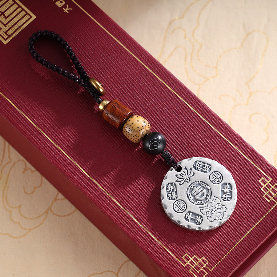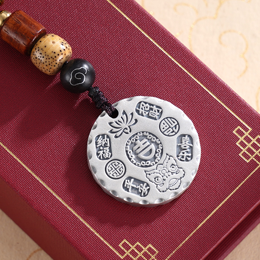 【寓意】:经典的圆牌吊坠,錾刻莲花、醒狮等吉祥图案,复古祥和,深邃有质感。寓意平安喜乐,吉祥如意。