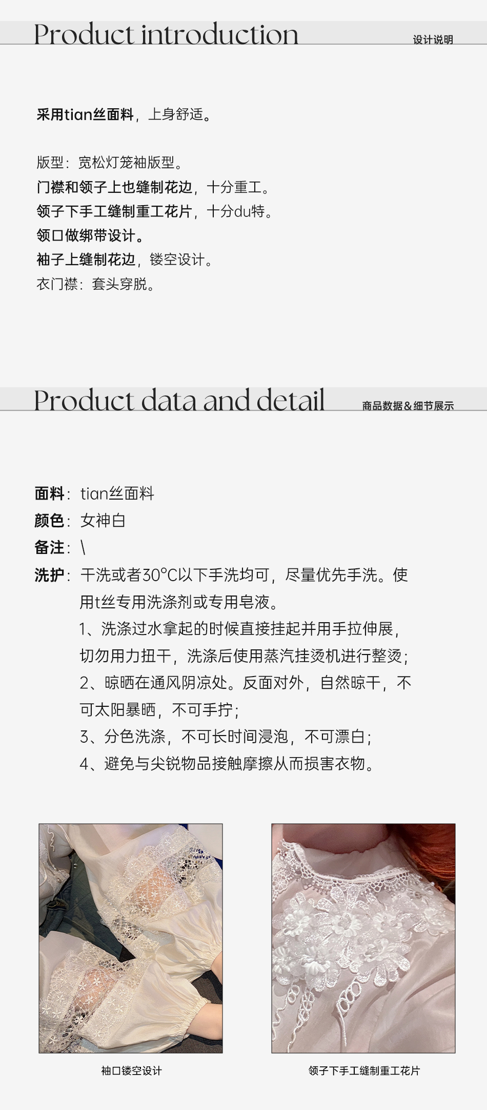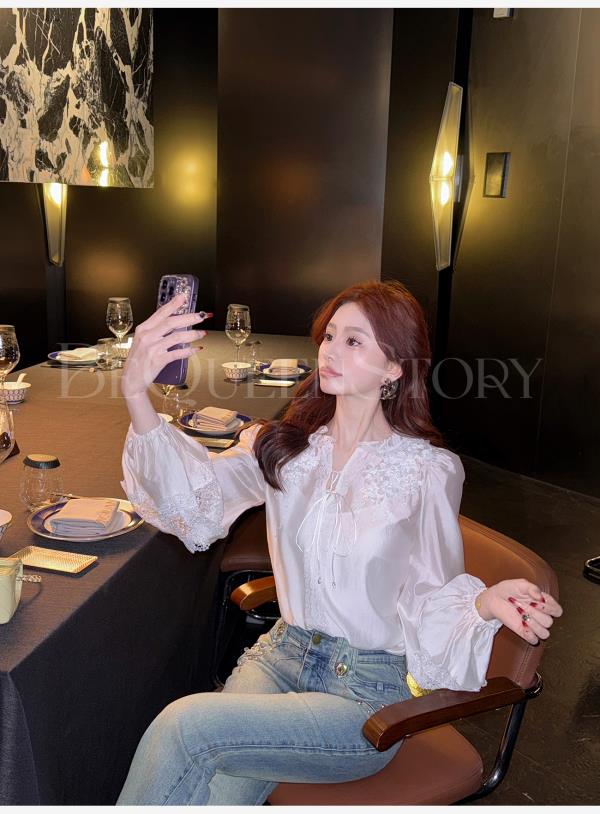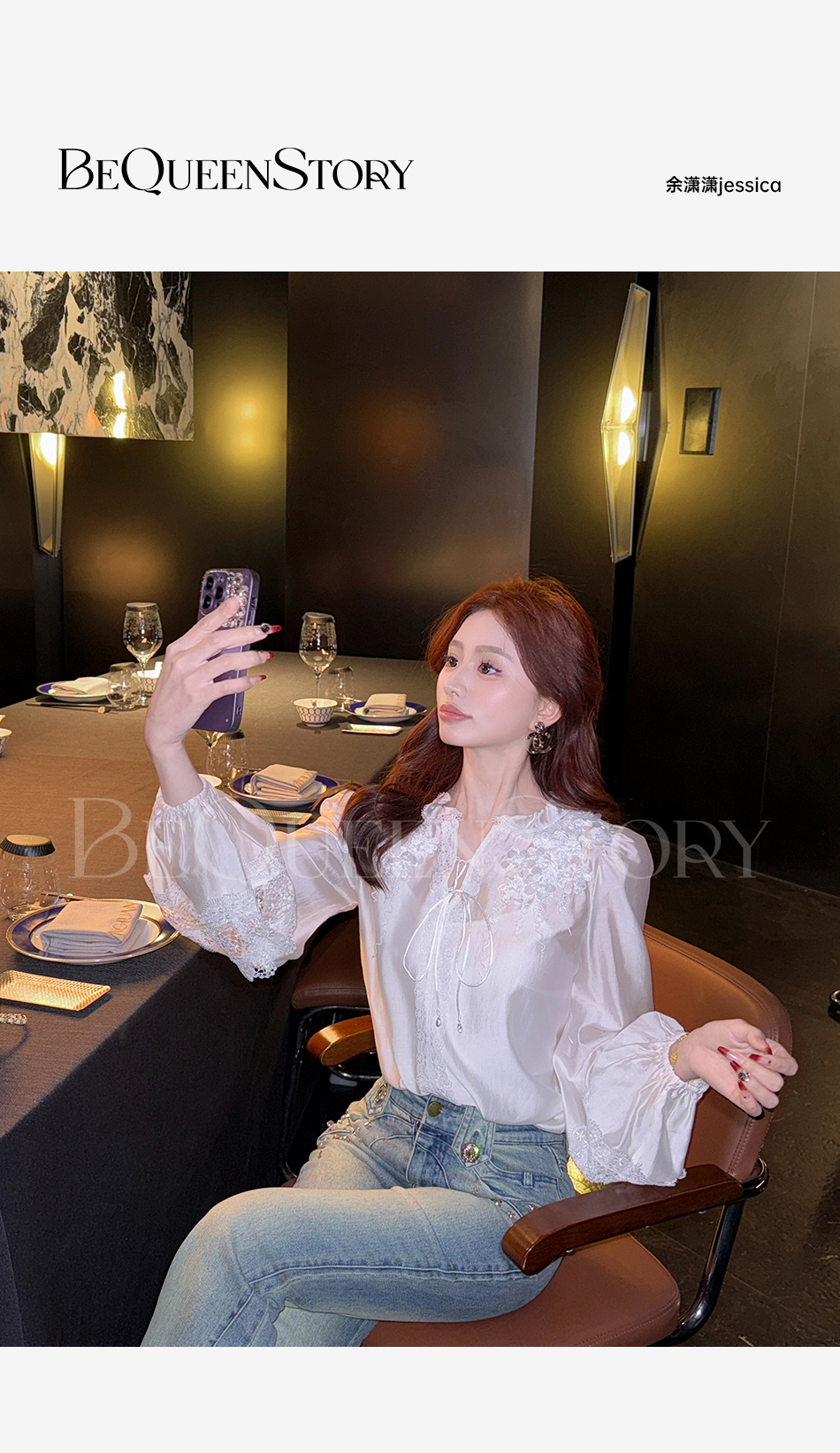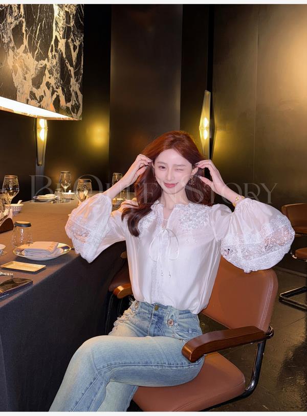 余潇潇【梦幻清荷】2025年早春新品重工花片宽松显瘦镂空灯笼袖衬衫