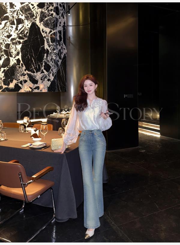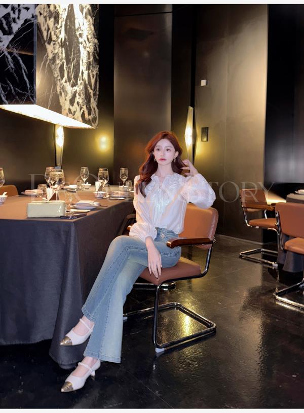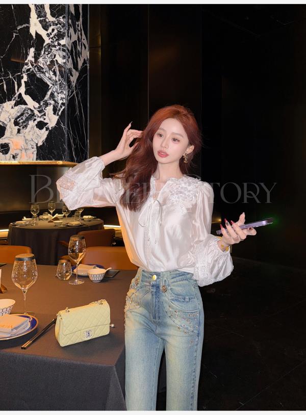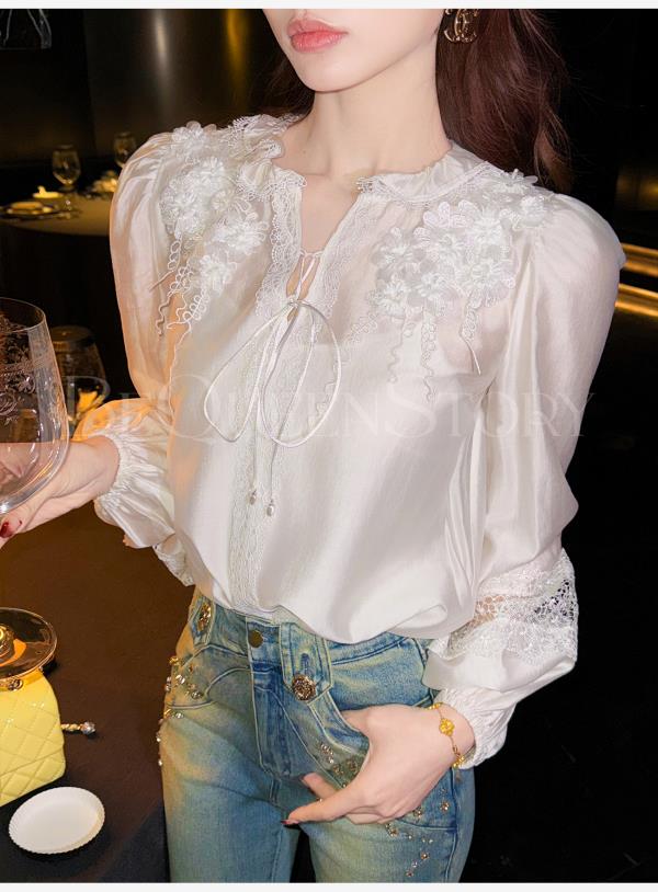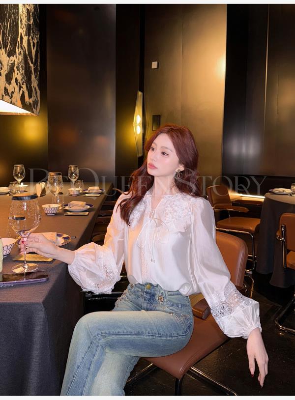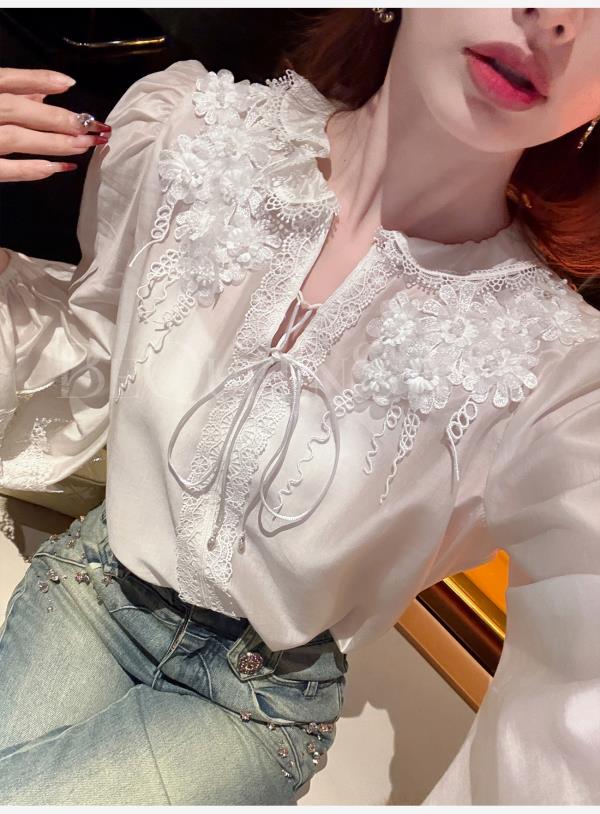 余潇潇【梦幻清荷】2025年早春新品重工花片宽松显瘦镂空灯笼袖衬衫