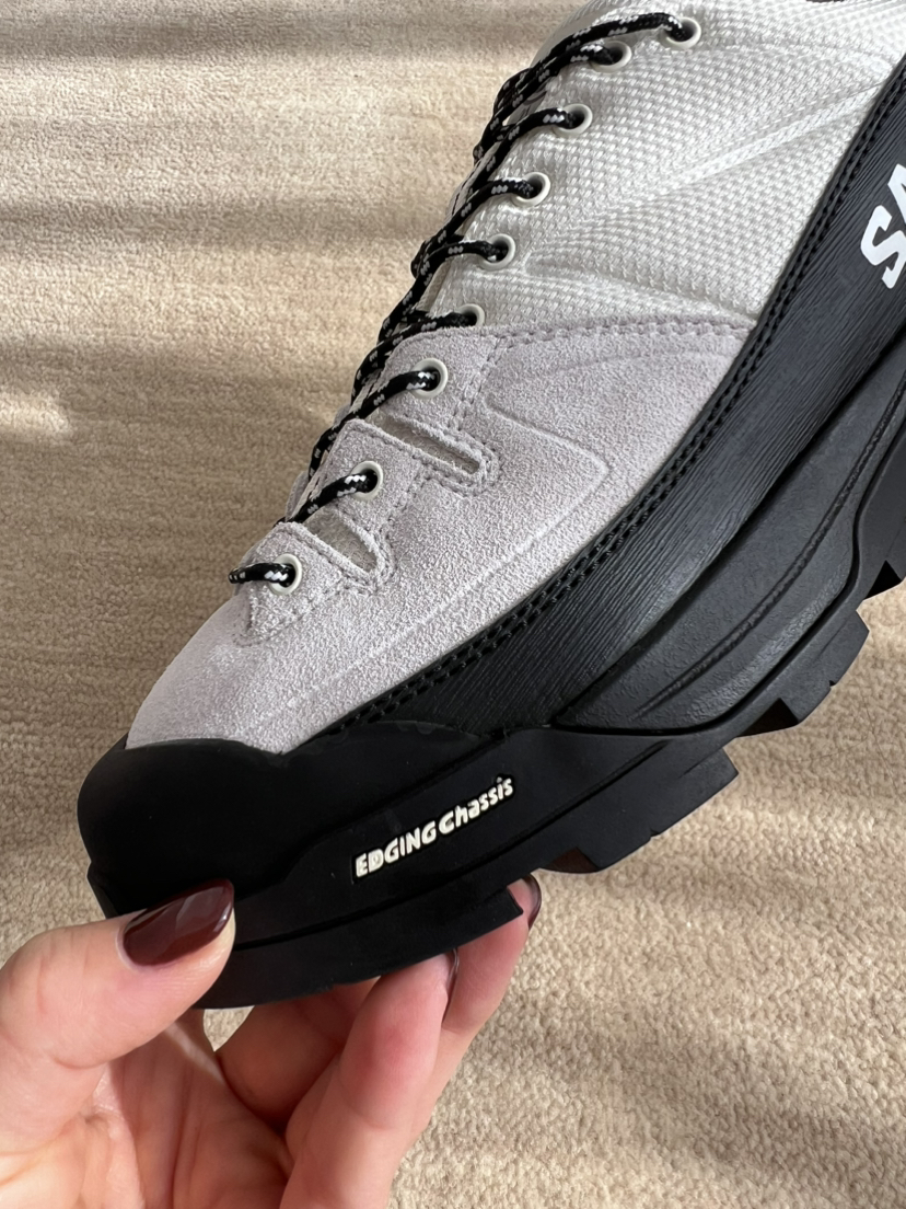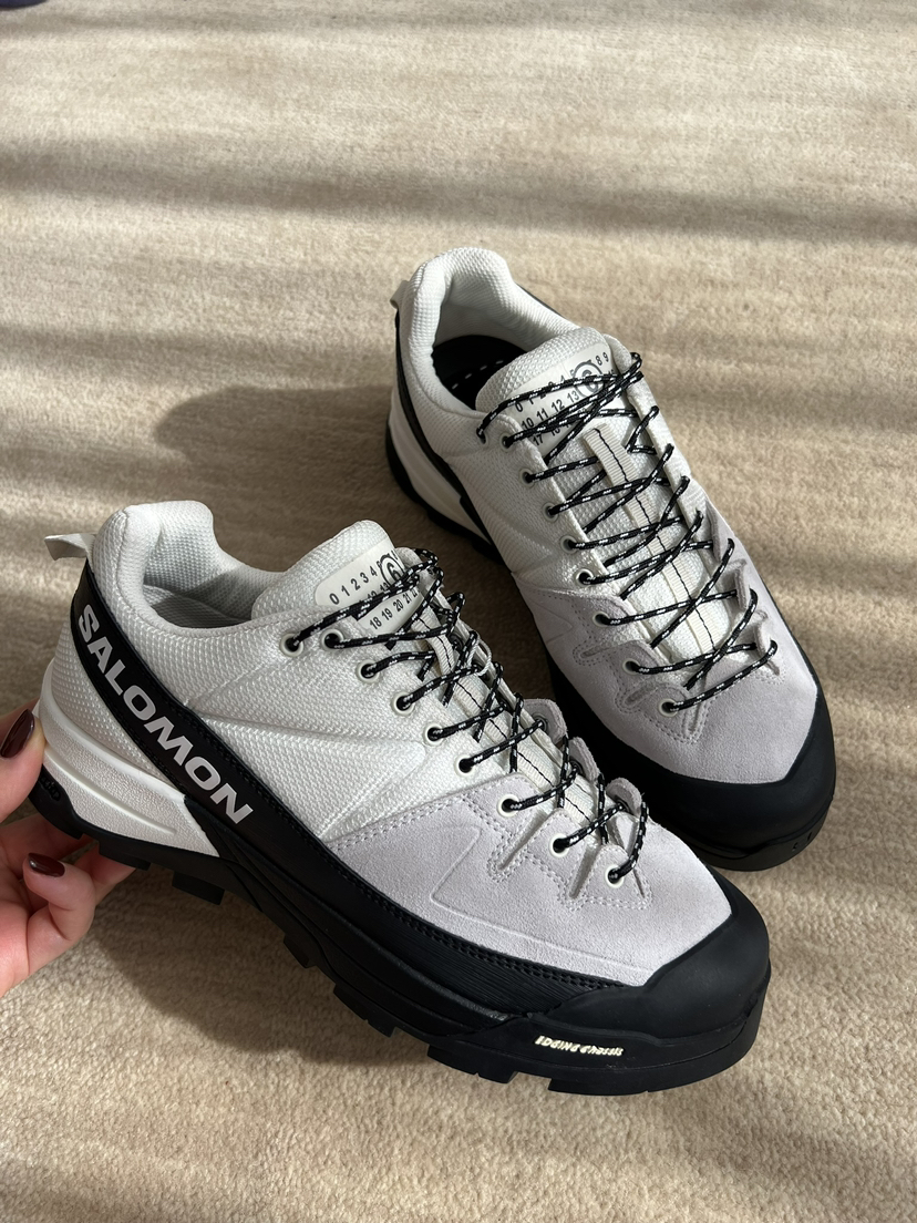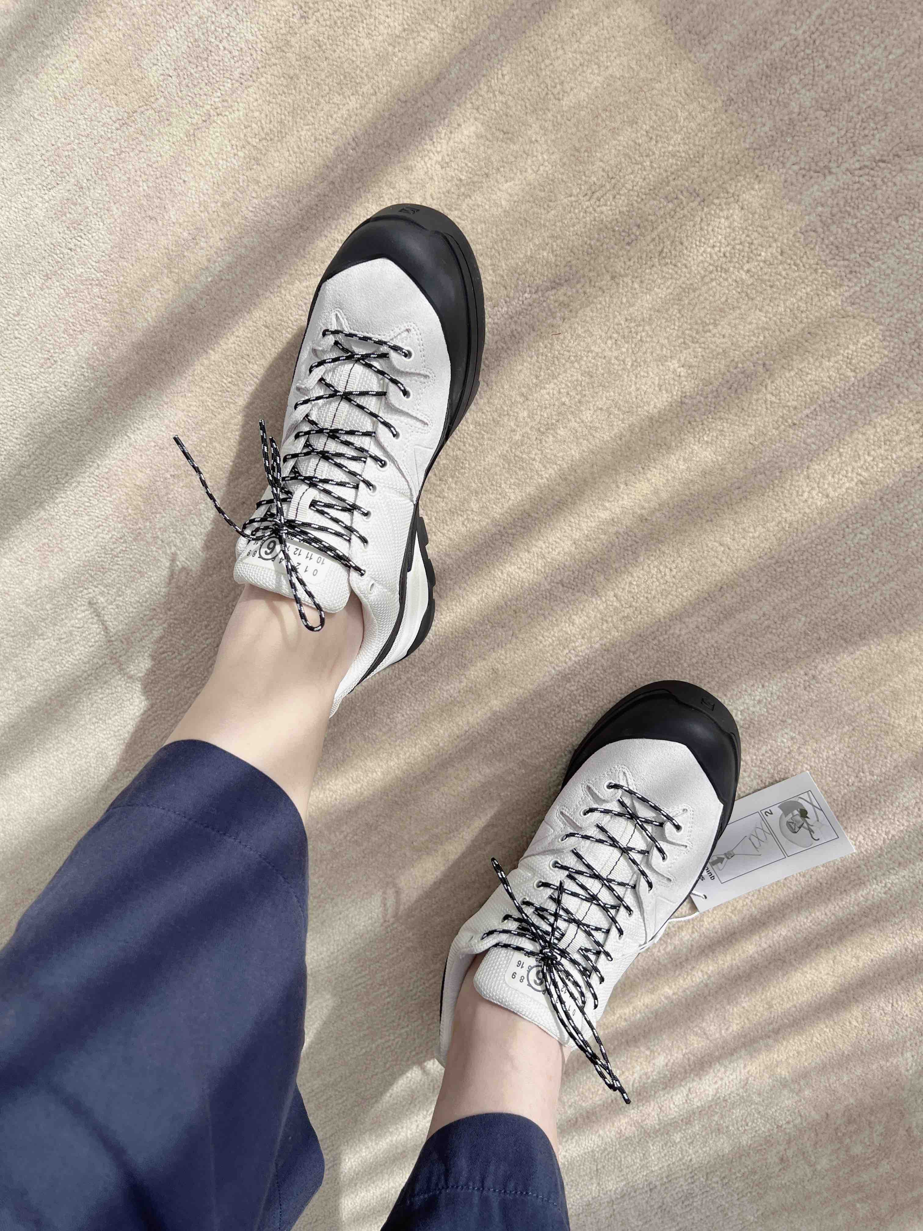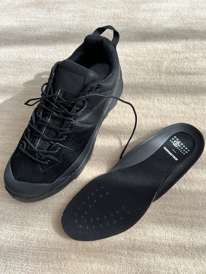 这次是MM6选了X-ALP作为合作款的底板,这个原型也是sal以往专业的登山鞋款,鞋子使用的是3D edgingchassis稳定系统,我其实不懂啥系统,穿上就是相当的稳当,扎实,挺拔,耐用,中底软弹,外底够支撑,够防滑耐磨,虽然不是超软的鞋款,但是日常完全足够了。