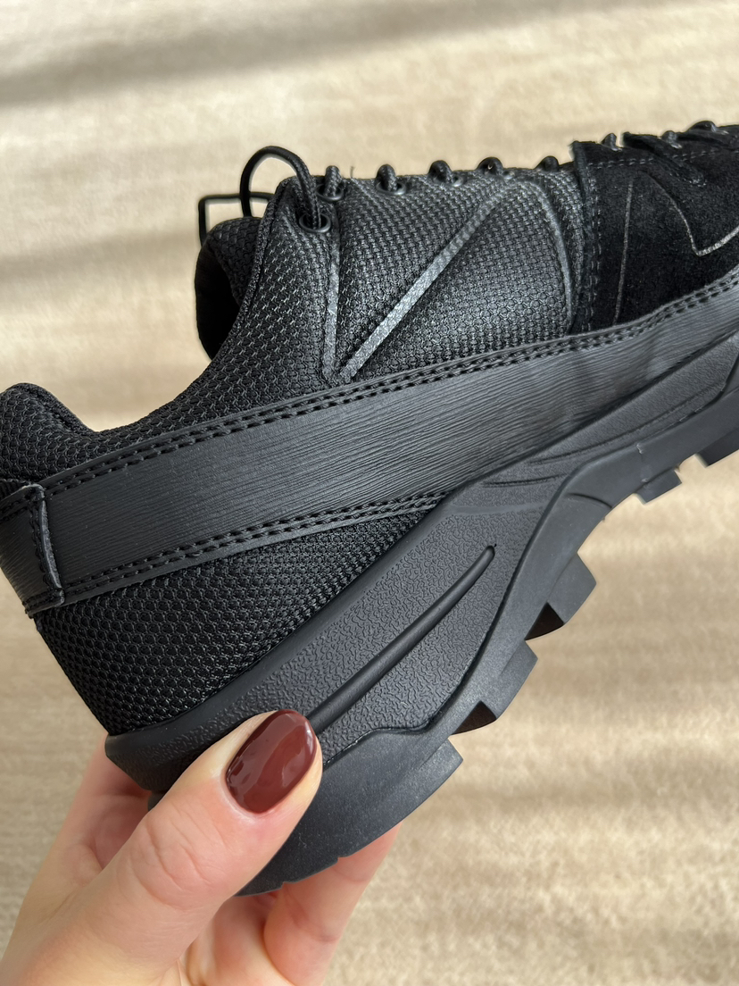 虽然吧,全黑色,但是呢,鞋面橡胶,麂皮,网布,不同材质的黑色,呈现了不同的折射率,这就尤为丰富有层次,五彩斑斓的黑色,完全不会显得沉闷。鞋底那个红点,看到瞬间就想出门蹦跶蹦跶。。。。。