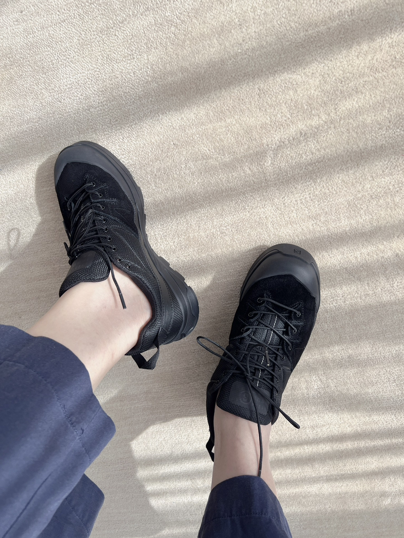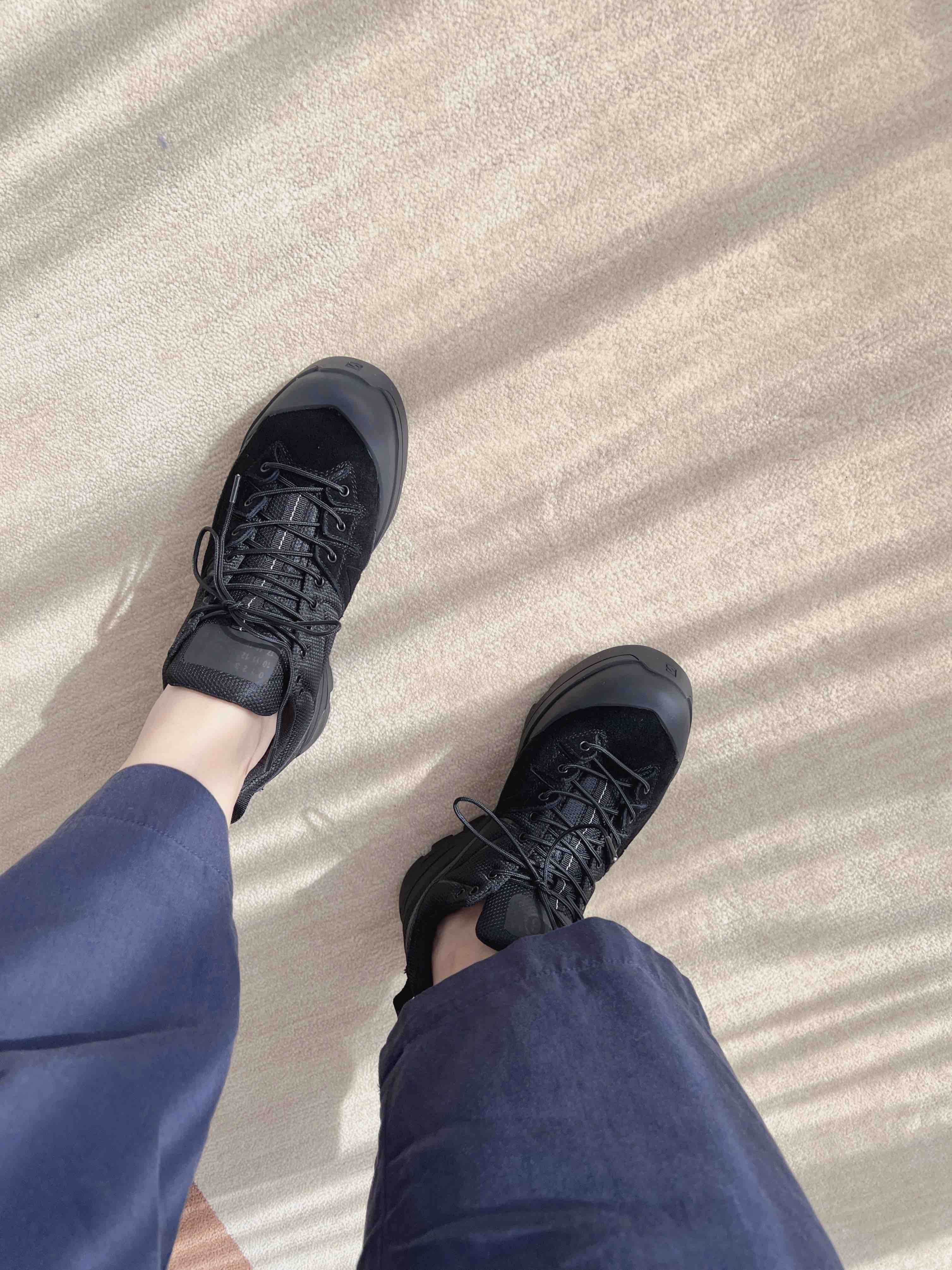 仔细看细节,鞋舌是这种半固定式的,就不用担心鞋舌走位,整体兼具户外登山功能,日常休闲运动,完全轻松应对。说实话,黑色穿去上班,一般是瞧不出有啥不对劲的,低调,冷静,高级,看得懂的都会心照不宣,嗯,这个人有品味的