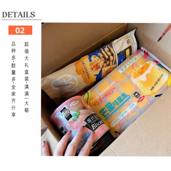 【规格】澳洲肉条/盒90g+加州综合坚果/盒50g+随机水果味果冻(芒果、草莓、蓝莓随机)/包420g+巧趣杯/包 152g+随机口味棉花糖(草莓、什锦、小青柠随机)/袋20g+随机口味酸奶奶盖(杨枝甘露、综合果干、小资白桃随机)/袋 108g+随机口味炭烧天妇罗(蟹黄味、芥末味、墨西哥辣味、 板烧章鱼味随机)45g