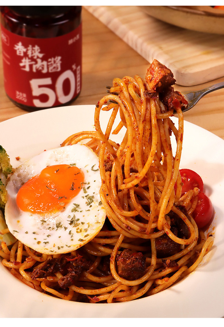 50%真牛肉添加肉多料足一口酱,满口香。 —— 进口整切真牛肉添加,轻食健身,真正的0脂肪牛肉酱,一勺仅2.6大卡!