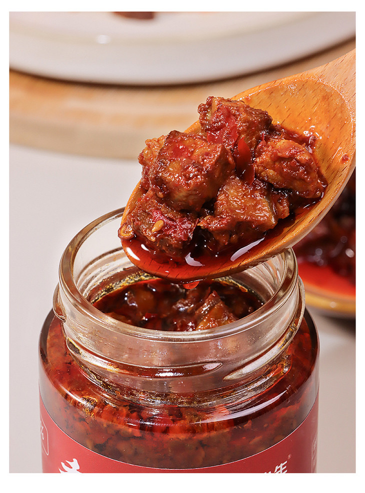 ✨【名称】50%香辣牛肉酱 ✨【配料表】牛肉(以生牛肉计>50)、菜籽油、水、复合调味料、辣椒、黄豆酱、豆豉、蒜、姜、白芝麻 ✨【净含量】200g ✨【贮存条件】存放于阴凉干燥处,开启后需冷藏并尽快食用 ✨【保质期】18个月