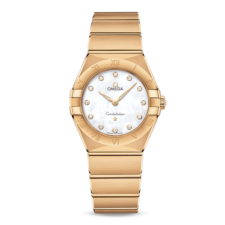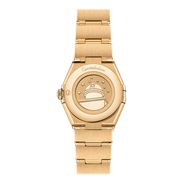 镜面材质 | 蓝宝石水晶玻璃 | 表盘 | 经典的半月形切面、“托爪”以及mono-rang表链。 黄色18K金腕表,表圈镌刻罗马数字刻度,白色珍珠母贝表盘,饰有钻石小时刻度,覆以耐磨损蓝宝石玻璃表镜。表链、指针、欧米茄品牌标识、星座徽标以及钻石托槽亦以黄色18K金打造而成。 密底 |