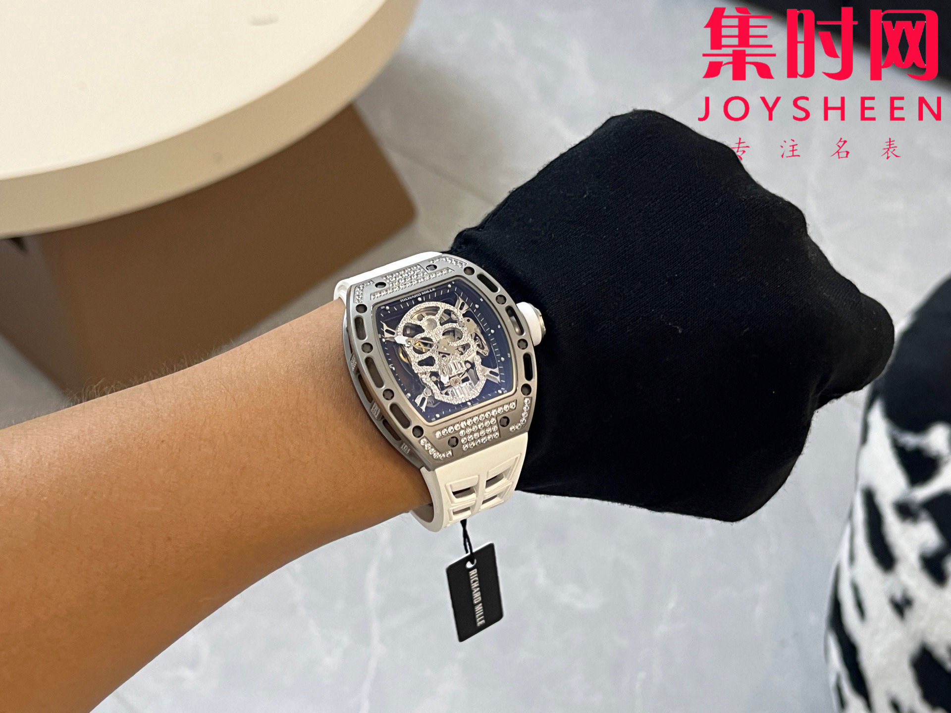 理查德米勒 RM052骷髅满天星 钻圈款 男士腕表 搭载定制一体手动上链机械机芯,鬼头经典传奇 镂空骷髅头腕表.骷髅头轮廓突出,造型霸气不羁,具有震撼人心的魅力。搭配艳耀色彩的橡轻便表带,更拉风,更前卫。腕间搭上鲜艳的表款,是不是很吸睛?表壳尺寸:43mmx50mm 真实展现!