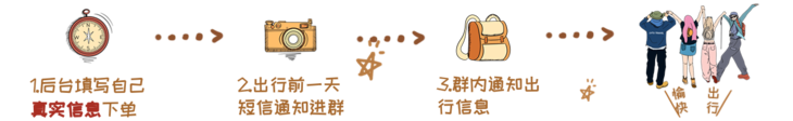 1、报名时请提供 【真实姓名、本人电话、身份证号码】,方便统一购买旅游保险。出发前一日20:00之前,工作人员发送短信通知到您预留的手机上(包括上车地点、时间,车牌,行车助理电话及注意事项等),出行前一天晚上20:00如没有收到短信通知,请及时在公众号与客服联系。