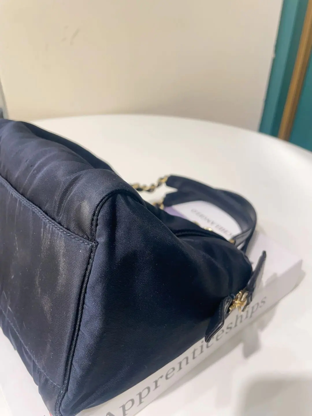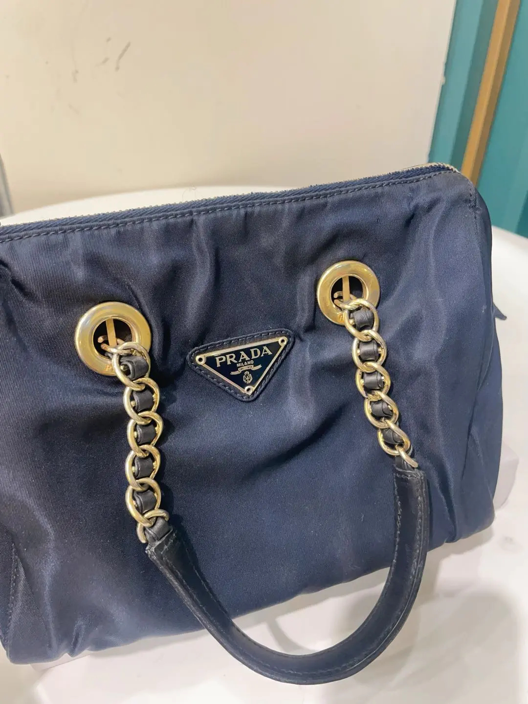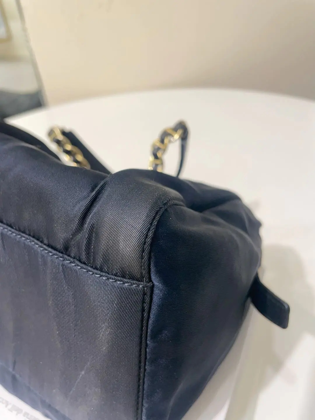 【商品详情】正品二手 prada 小号 黑金 降落伞布 波士顿包🖲️ 9新 21×17 包身使用脏 五金与链条配皮部分磨损与氧化 内里拉链头配皮正常磨损感 内里刺绣轻微脱丝 超级性价比捡漏款