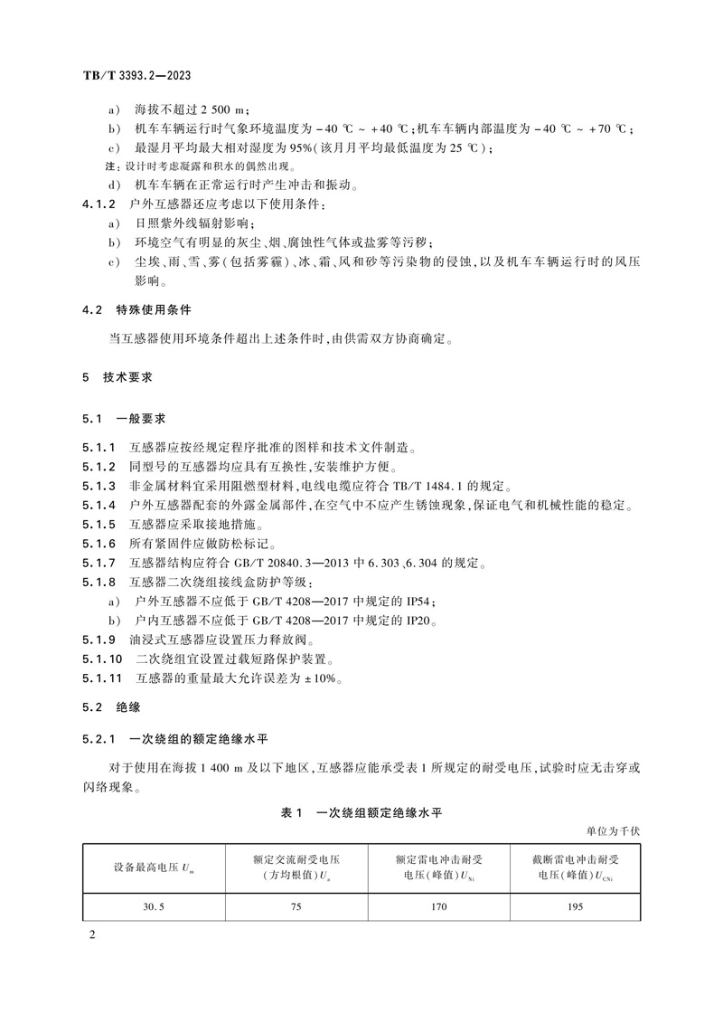 本标准为国家铁路局发布的铁道行业标准,技术标准2023年第1批(共12项标准),国家铁路局公告 2023年第2号,铁标名称:《机车车辆高压互感器 第2部分:电磁式电压互感器》 TB/T 3393.2-2023,代替标准TB/T 3393.2-2015。本文件规定了机车车辆高压电磁式电压互感器的使用条件、技术要求、试验方法、检验规则、标志、包装、运输和储存。本文件适用于标称电压25 kV,额定频率50 Hz的机车车辆电气测量和保护用的电磁式电压互感器(以下简称互感器)。