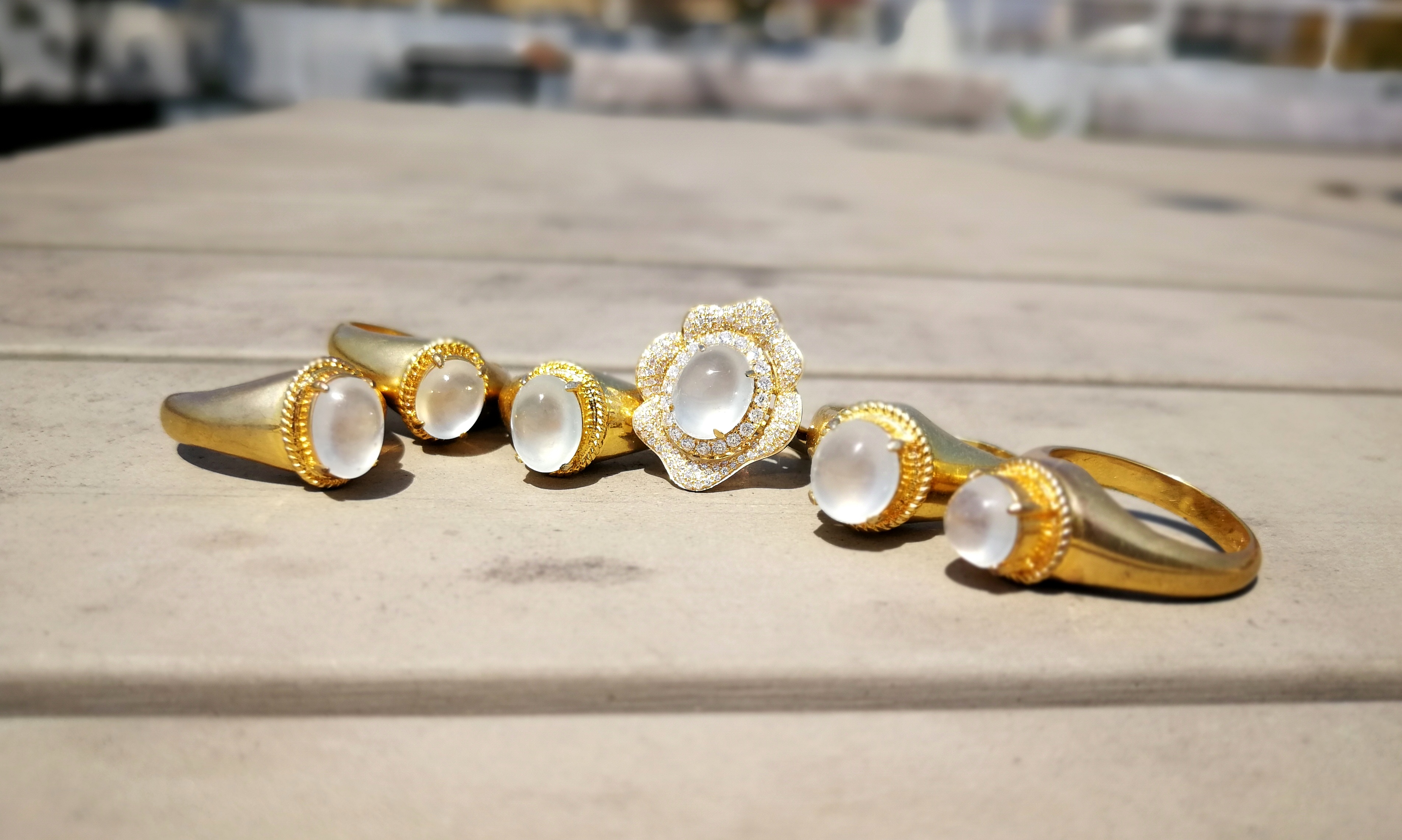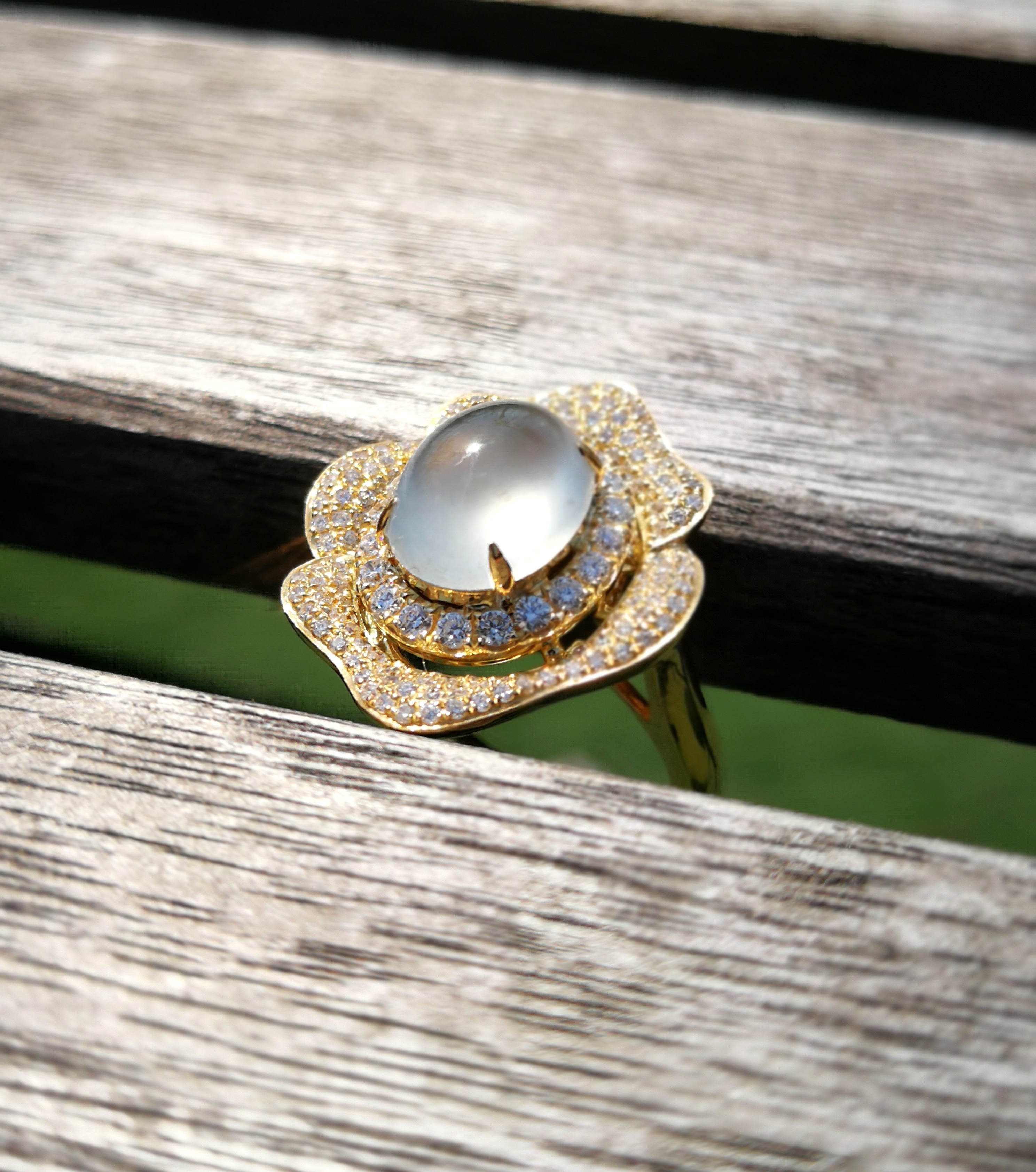 一手最好的白色玻璃种翡翠蛋面,我们挑选了一只线条浑圆的戒面来设计这只猫咪戒指。