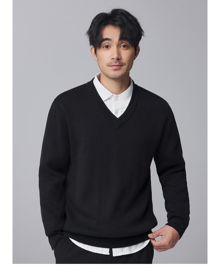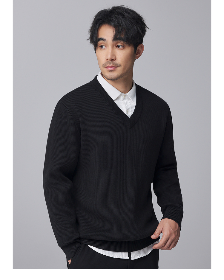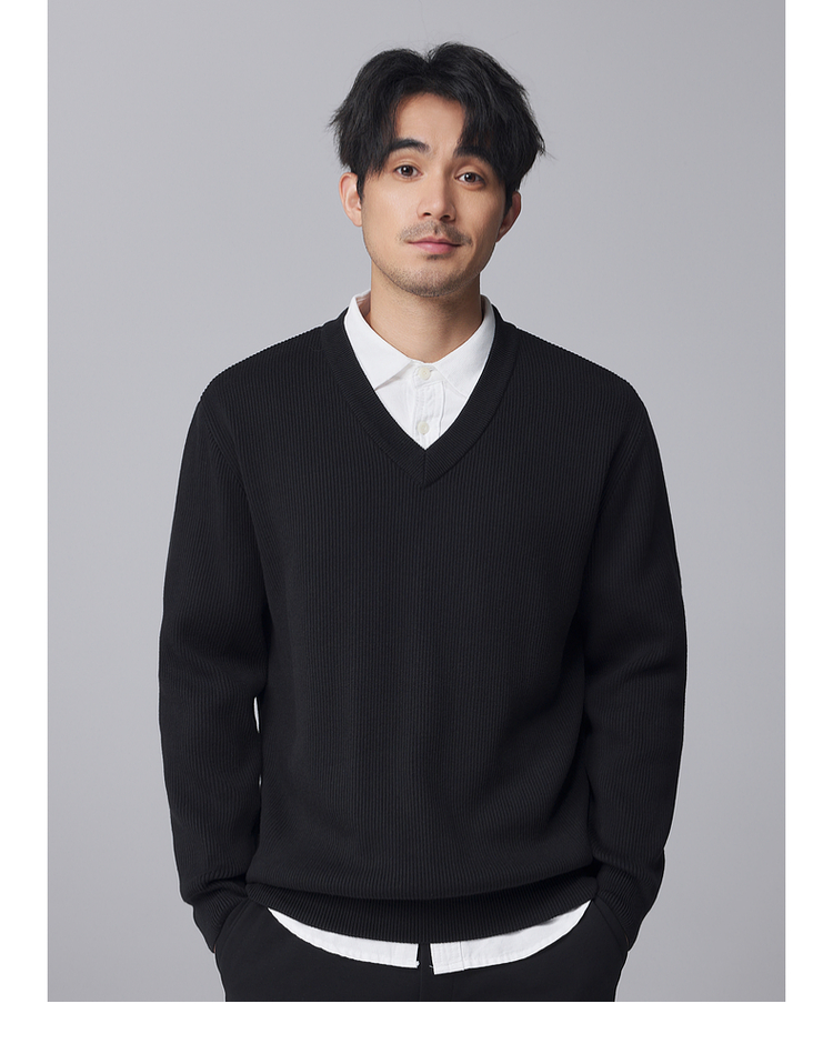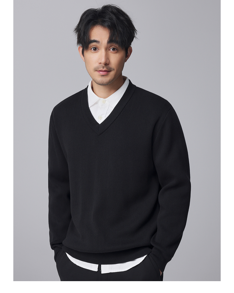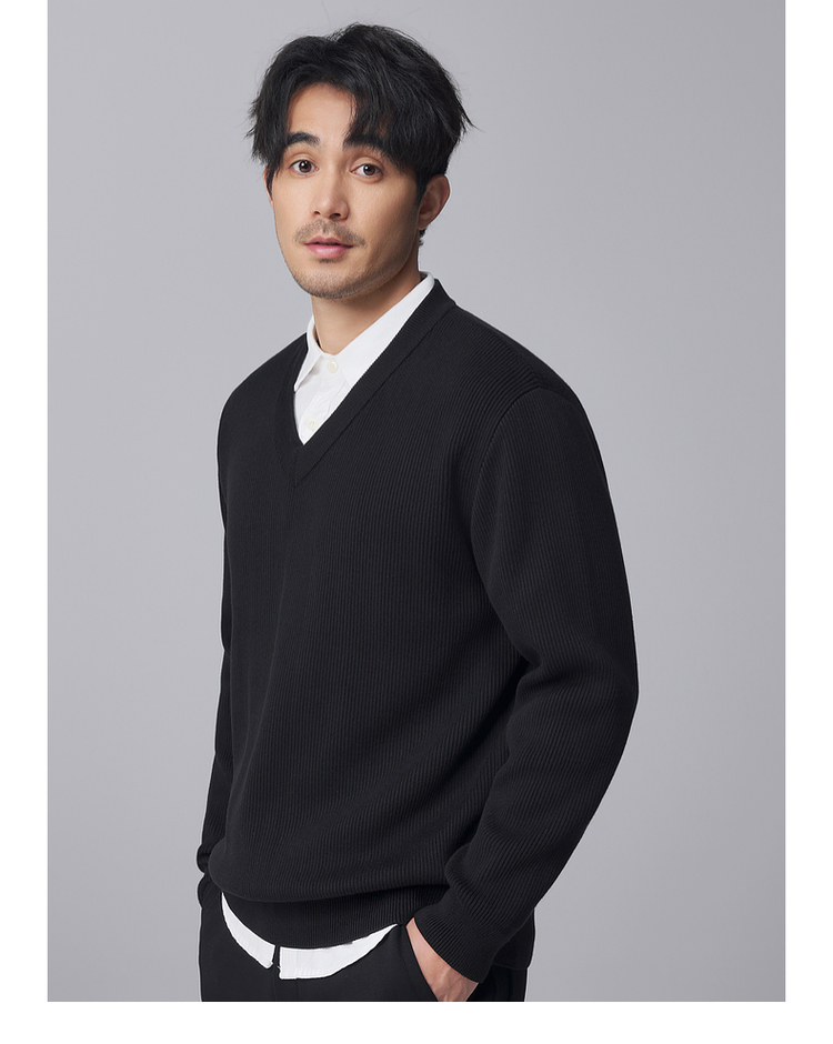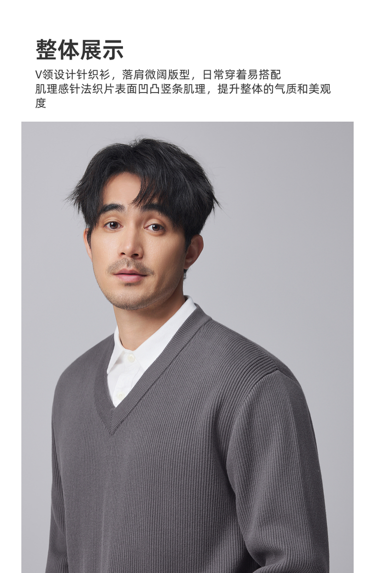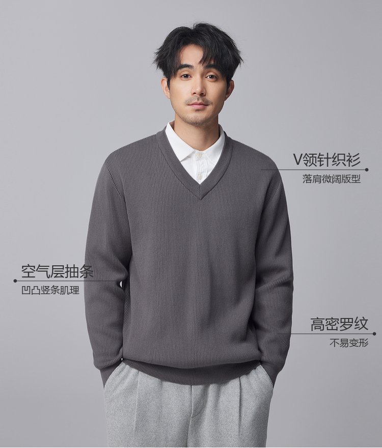 墨麦客男装竖条肌理V领针织衫男士2024冬季新款宽松打底衫毛衣男
