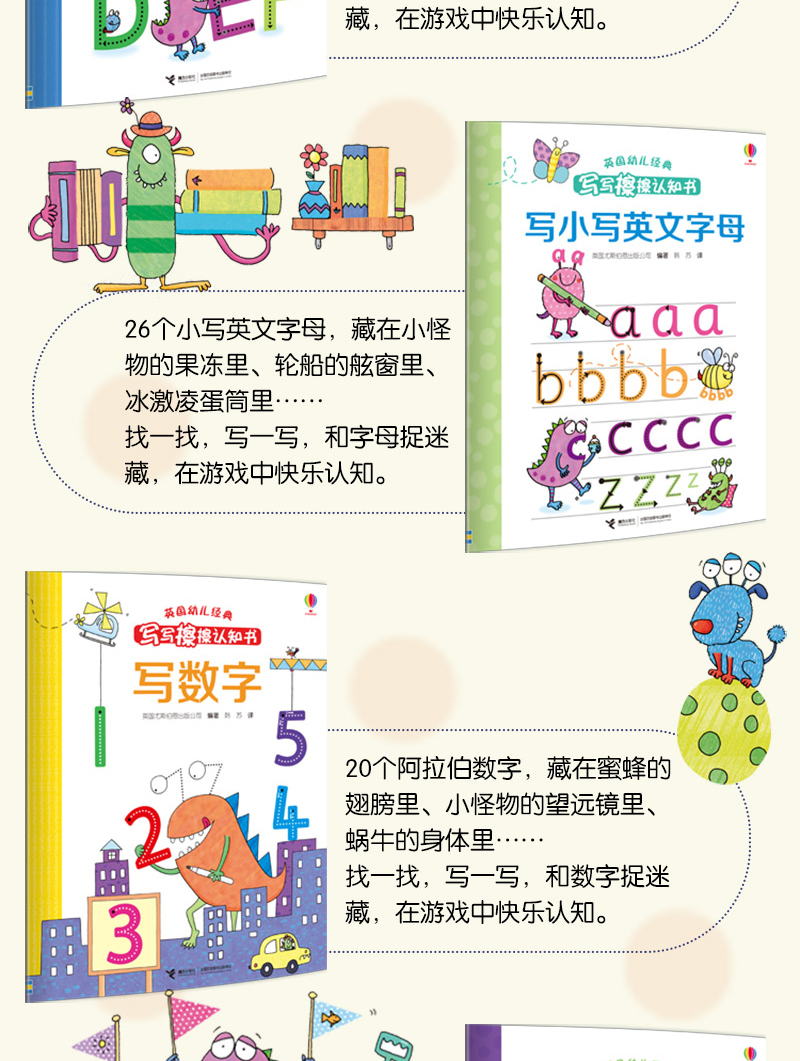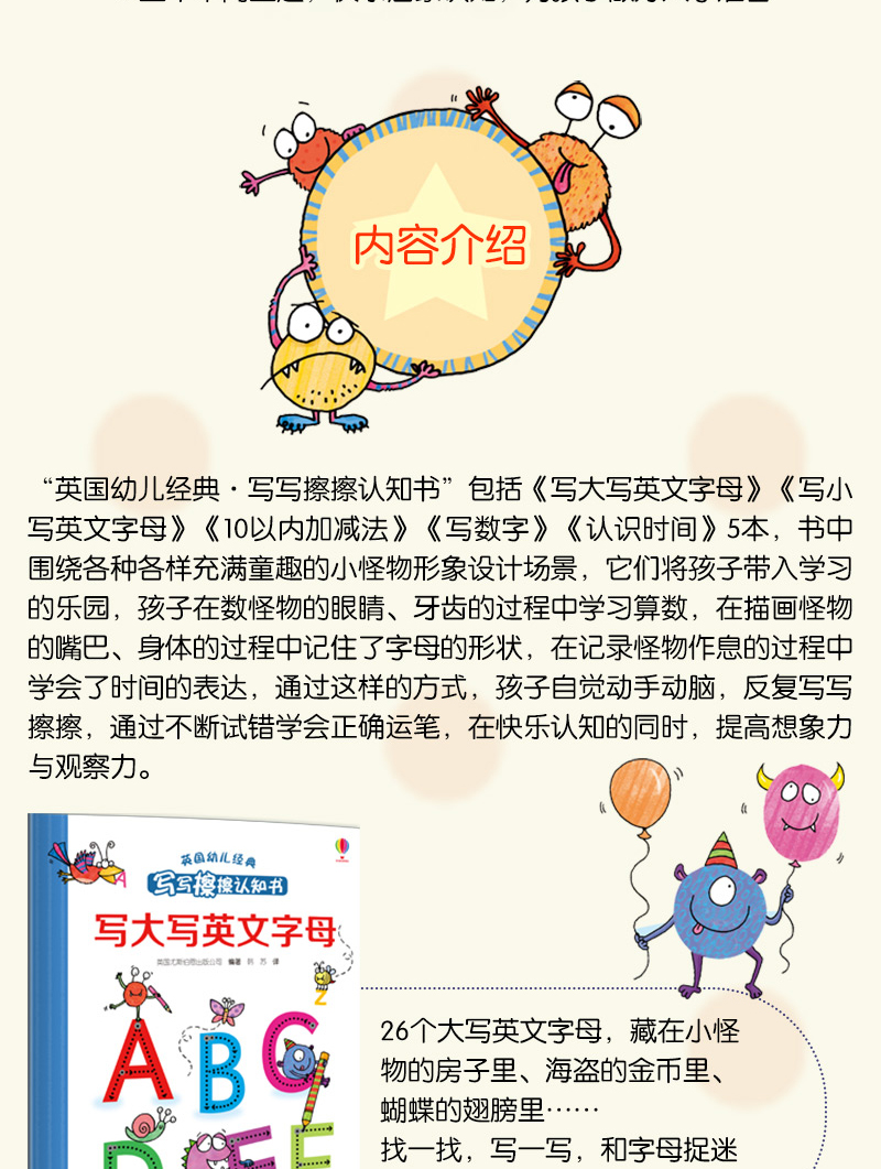 “英国幼儿经典 写写擦擦认知书”包括《写大写英文字母》《写小写英文字母》《10以内加减法》《写数字》《认识时间》5 本,书中围绕各种各样充满童趣的小怪物形象设计场景,它们将孩子带入学习的乐园,孩子在数怪物的眼睛、牙齿的过程中学习算数,在描画怪物的嘴巴、身体的过程中记住了字母的形状,在记录怪物作息的过程中学会了时间的表达,通过这样的方式,孩子自觉动手动脑,反复写写擦擦,通过不断试错学会正确运笔,在快乐认知的同时,提高想象力与观察力。