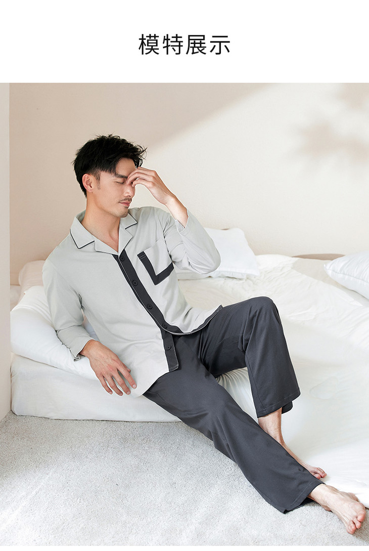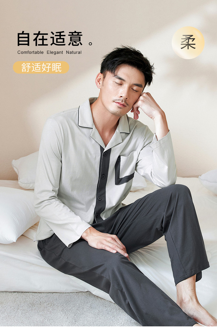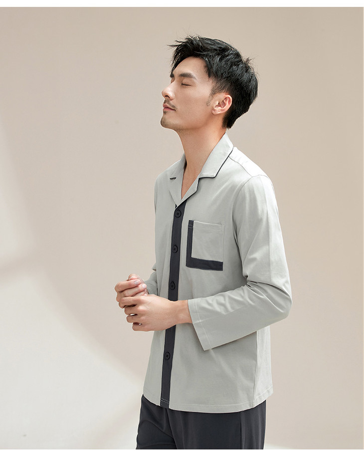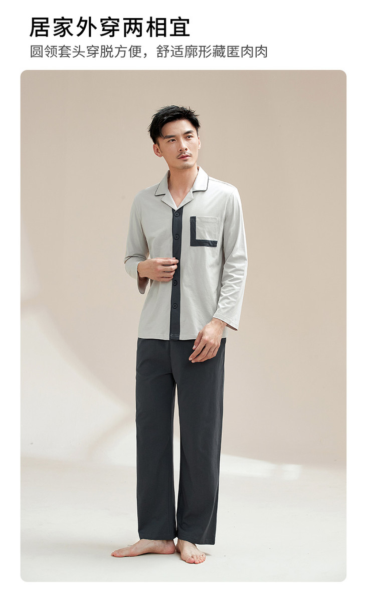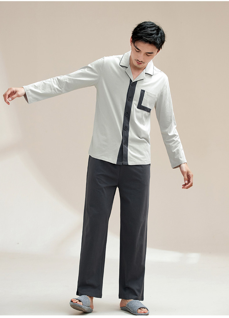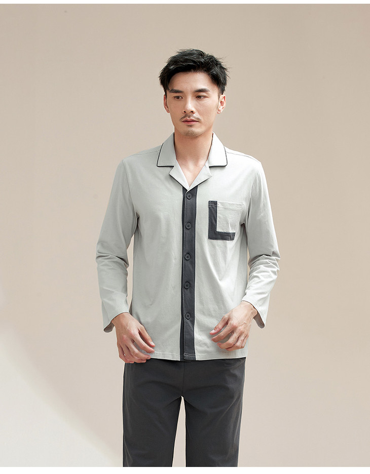 康妮雅睡衣家居服 男式长袖长裤开襟套装*浅灰