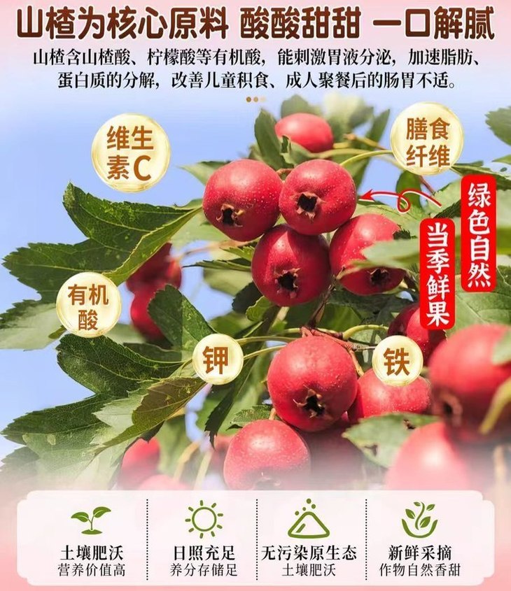其次,山楂的营养更是堆到满格💯 含有多种有机酸、膳食纤维、维生素、钙、磷、铁等 尤其是维生素C含量,真的绝了❗️ 山楂VC是苹果的13倍🍎,是柠檬的2.4倍🍋 就连VC之王柠檬都不及它❗️ 平时吃一点,还能补充维生素,增强抵抗力💪 健康和美味两手抓,血赚不亏啊宝子们💰