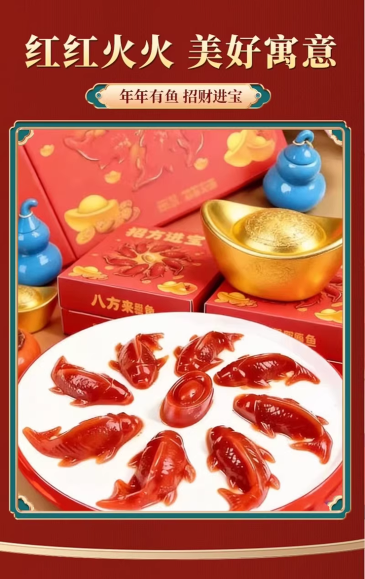 咱们的八方来财礼盒🎁更是好寓意! 八条锦鲤山楂鱼围绕中间的红元宝💰 妥妥的团圆好礼,年年有鱼🐟 红果映锦鲤🍒鸿运照全年🧧 过年讨好彩头就靠它了✨ 不管是送父母、送亲戚、送朋友👭都倍合适有面 谁收到这么好看又好吃的礼盒能不开心啊🥰
