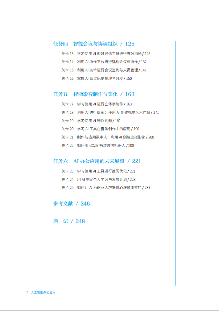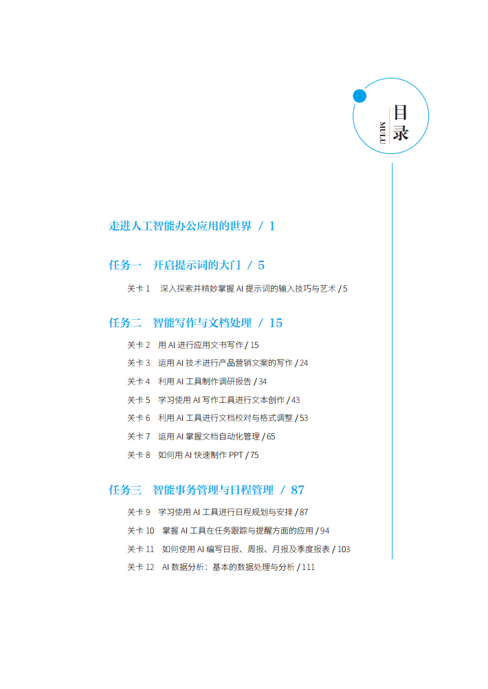 作者梳理了人工智能在办公环境中的应用场景,提炼出26个人工智能应用的典型工作任务,以深入浅出的闯关模式,力图营造出一种生动活泼有趣好玩的学习氛围,让读者在愉悦的心态中习得人工智能要义,掌握人工智能技艺,磨砺创新思维,提升工作效能。书中还搜集了一些人工智能应用的生动案例,作为学习的引导;同时还制作大量配套的资源,以帮助读者更好学习和理解;还有一些进程的知识点,需要读者利用人工智能工具进行拓展性实践。总之,本着以读者为中心,以技能为目标的编写理念,努力给读者呈现一本整合学习、训练、拓展功能的实用性教材。
