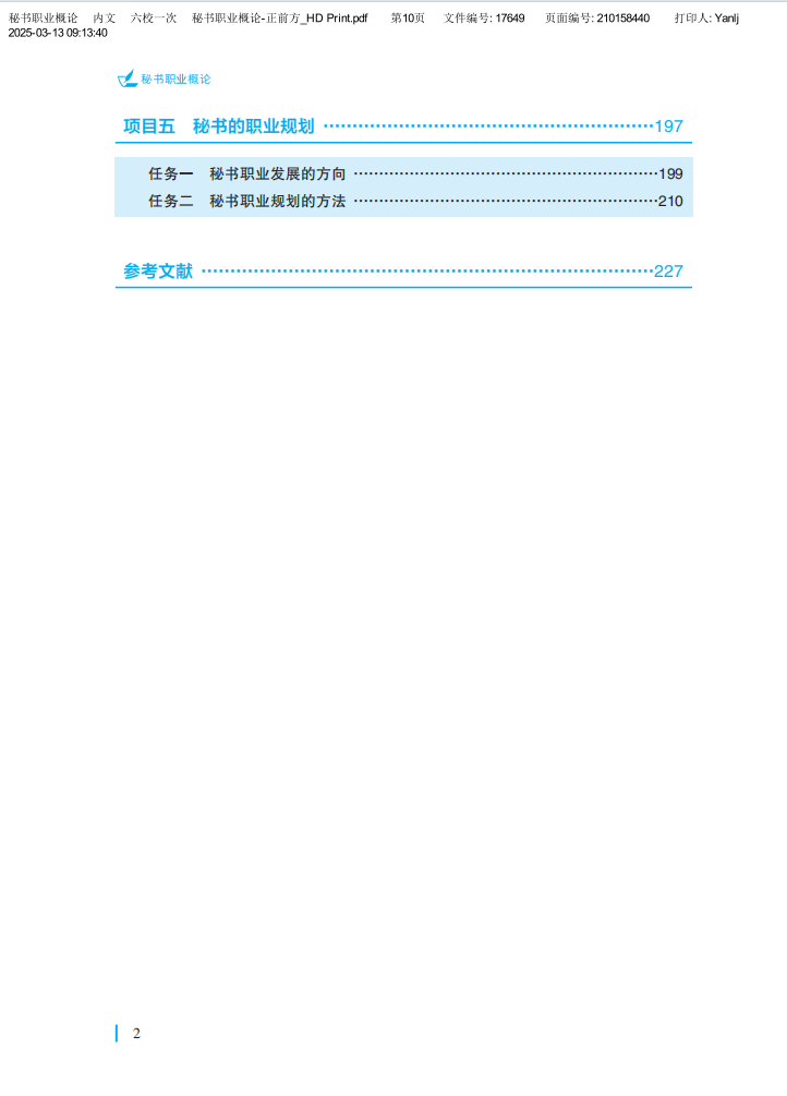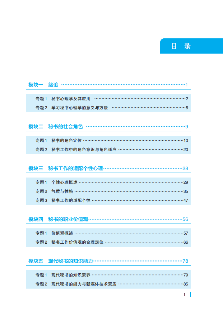 教材共五个部分,通过全面介绍秘书的职业要求、职业心态、人际关系、职业道德以及职业规划,为文秘专业的学生提供了一个系统的认知框架。教材的每一部分都遵循了问题导向模式,在设置了启发学生的“阅读与思考”和“任务导读”栏目之后,接着再阐释相关的概念,比较符合学生的认知规律。为了帮助学生构建从学习到工作的桥梁,教材还结合企业的实际需求穿插了丰富的工作案例,增强了实践指导,探讨了可能适用的解决问题的工作方式和技巧,将职业认知与职业实践紧密相连,为提高其岗位适应性打下了坚实基础。同时,为了落实“立德树人”的根本任务,教材将思政教育贯穿于教育教学的全过程,深入挖掘秘书职业所蕴藏的思政元素,以期培养具有奉献精神、服务意识、保密意识等高尚职业理想的学生。