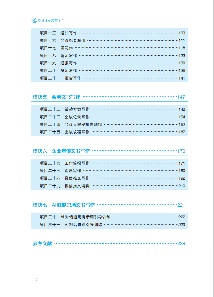 本书内容分三大块,第一部分简要介绍职场通用文书的写作基础;第二部分是主体,分别从求职文书写作、日常事务文书写作、职场通用公文写作、会务文书写作和企业宣传文书写作板块介绍相关的写作知识,最后讲了AI赋能职场文书写作。本书特色鲜明:注重写作思维训练,培养学生可持续学习能力;融入课程思政元素,提升学生社会责任感;开展AI赋能写作训练,紧密对接写作新技术;嵌入线上教学资源,满足学生个性化学习要求。