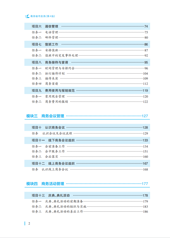 本书以商务秘书工作场景为主线,遵循商务秘书成长规律,围绕职业认知、生涯规划、“三办”工作等内容,设置了5个模块,共18个项目49个具体任务,通过任务描述、任务分析、任务准备、任务提示、任务实训、拓展阅读、秘书灯塔等,构筑了一个系统而全面的商务秘书知识架构。本书是“岗赛课证”融通教材,是“商务秘书专业证书”考试推荐使用教材,第2版系“十二五”职业教育国家规划教材,可作为职业教育本专科相关专业课程教学使用,可用于全国商务秘书职业技能大赛备赛参考,也可供一线秘书工作人员“充电”使用。