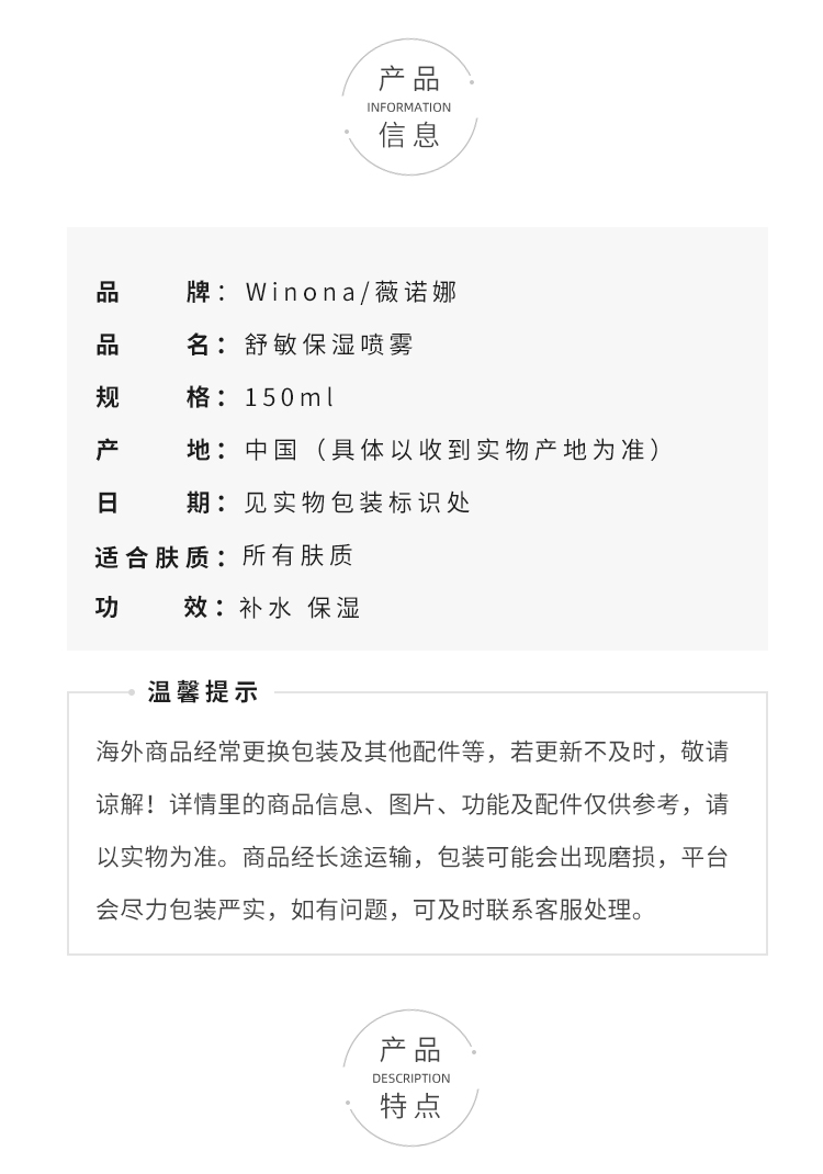 薇诺娜舒敏保湿喷雾150ml 敏感肌肤护肤品 补水锁水 舒缓修护清爽