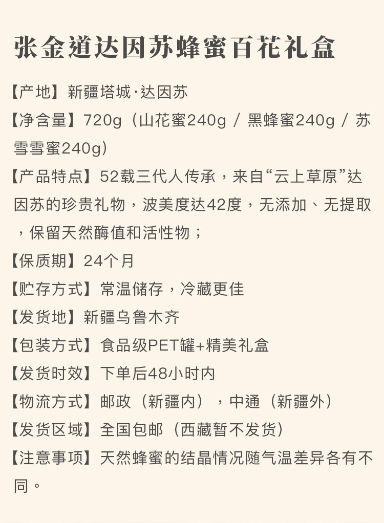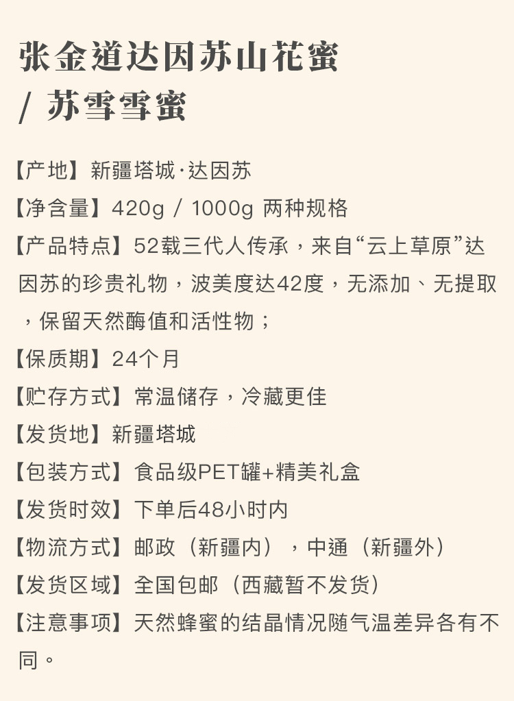 【品牌】张金道 【产地】新疆塔城 【净含量】420g、1000g、240g