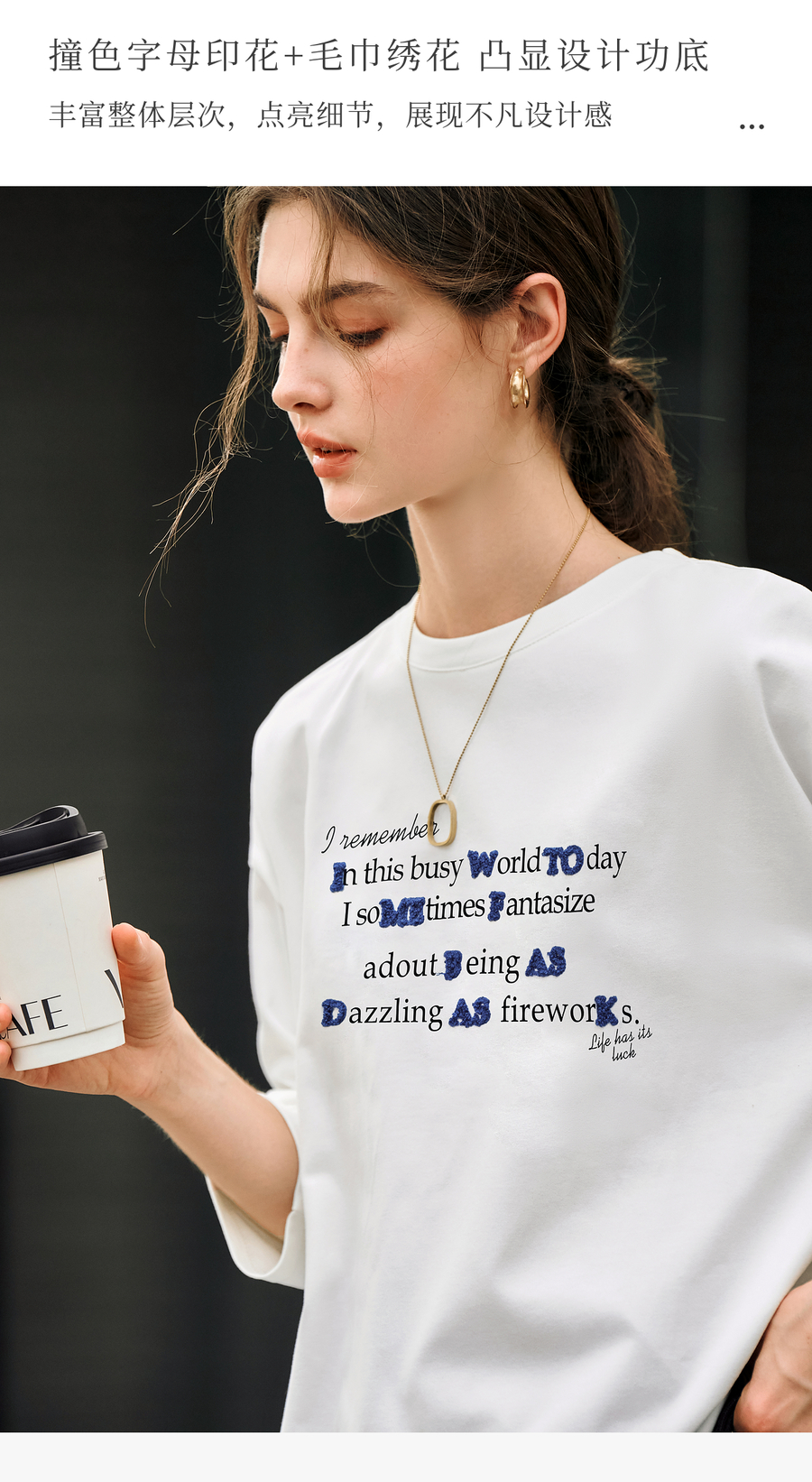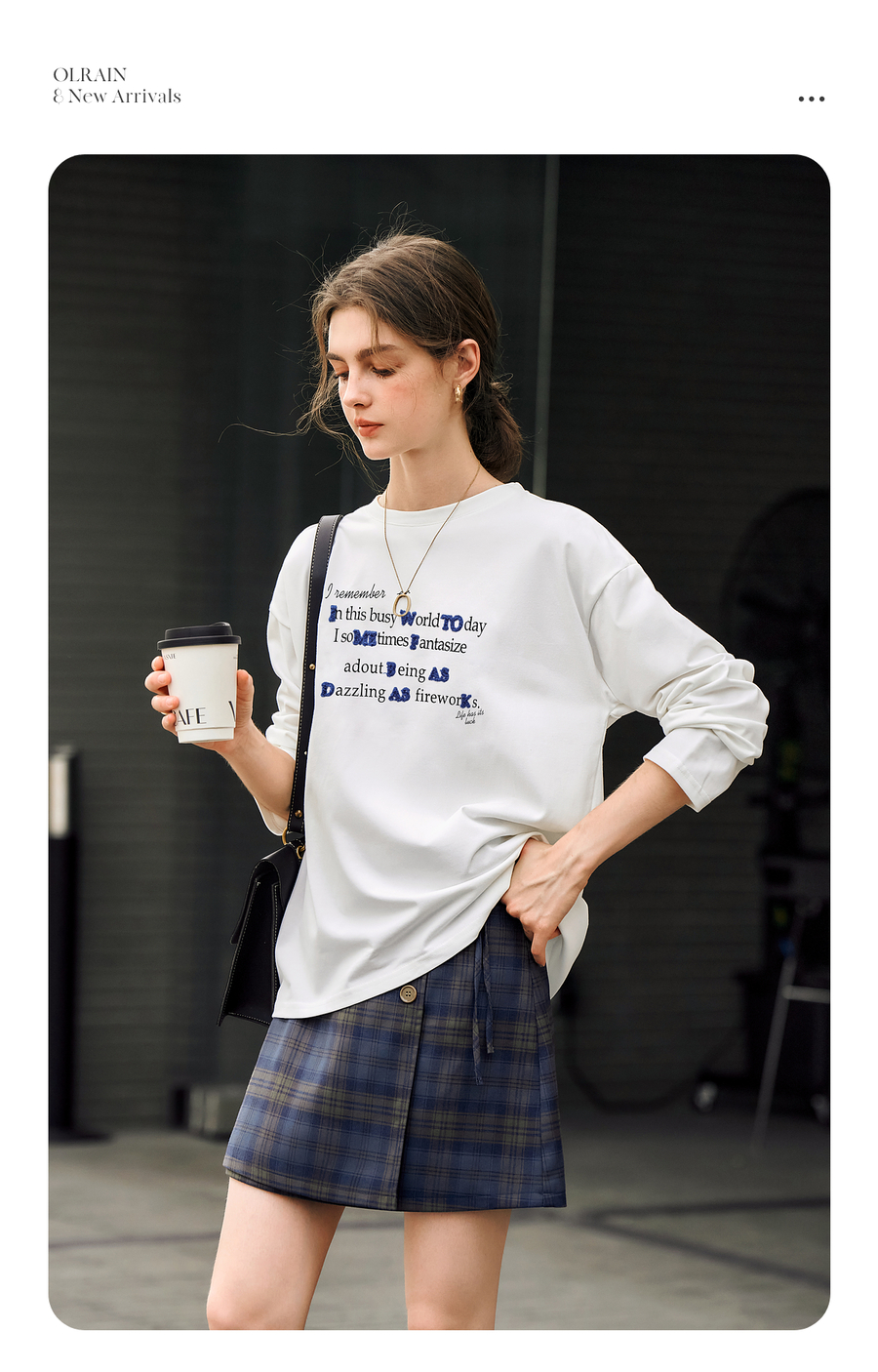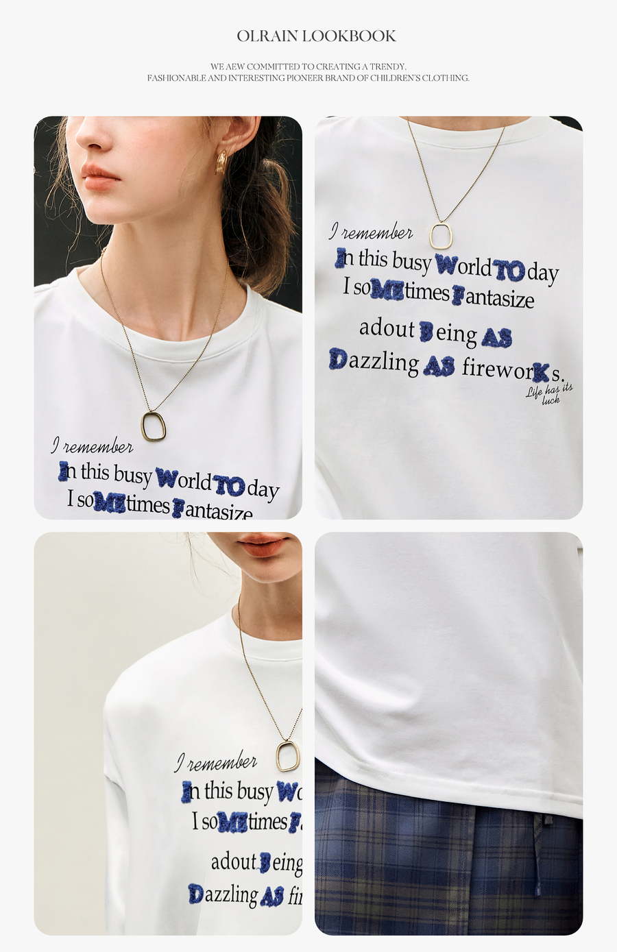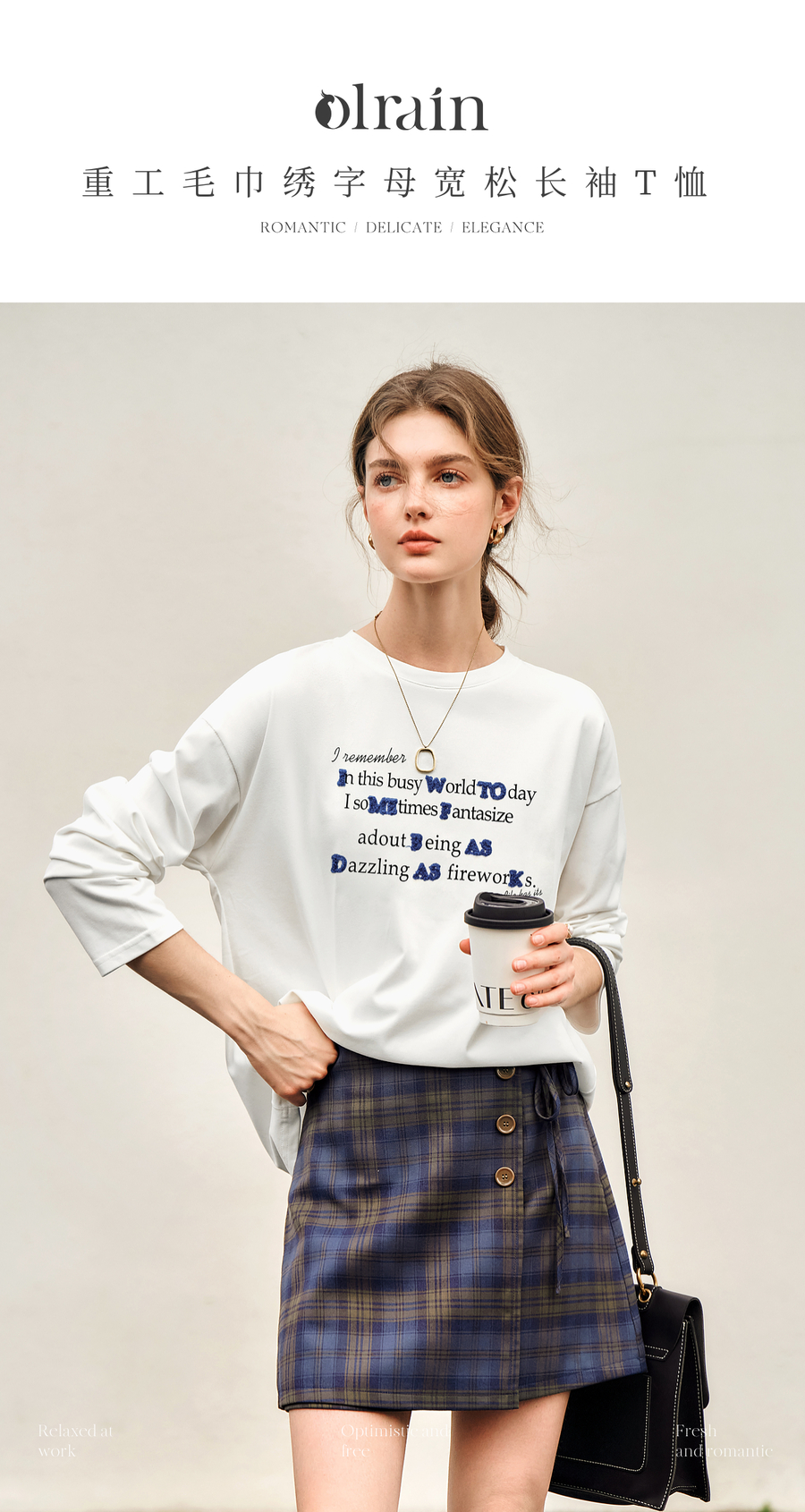 OLrain欧芮儿白色长袖T恤女冬季2024年新款重工毛巾绣宽松上衣