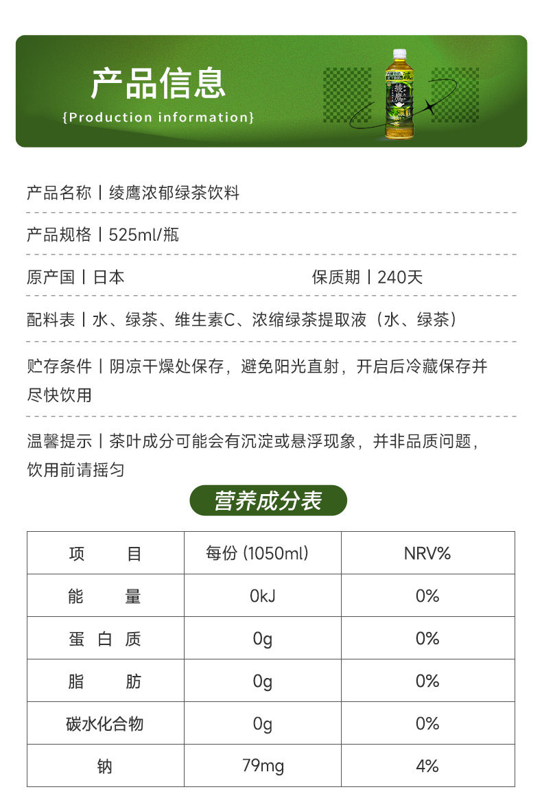可口可乐绫鹰浓郁绿茶525ml