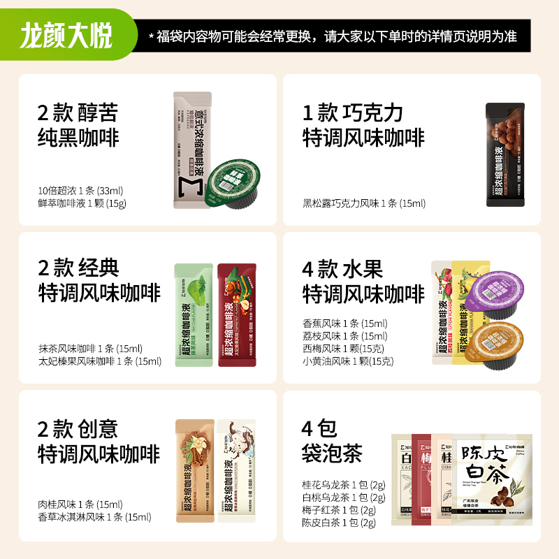 龙颜大悦福袋——本批次产品保质期:10倍保质期到26年3月21日;鲜萃咖啡液保质期到26年6月19日;黑松露保质期到26年7月15日;小黄油风味保质期到26年8月17日;西梅风味保质期到26年1月22日;香草保质期到26年3月19日;太妃榛果保质期到26年4月7日;香蕉保质期到26年3月19日,抹茶保质期到26年1月7日,荔枝保质期到26年1月6日,肉桂保质期到26年4月9日,太妃榛果保质期到26年4月7日。