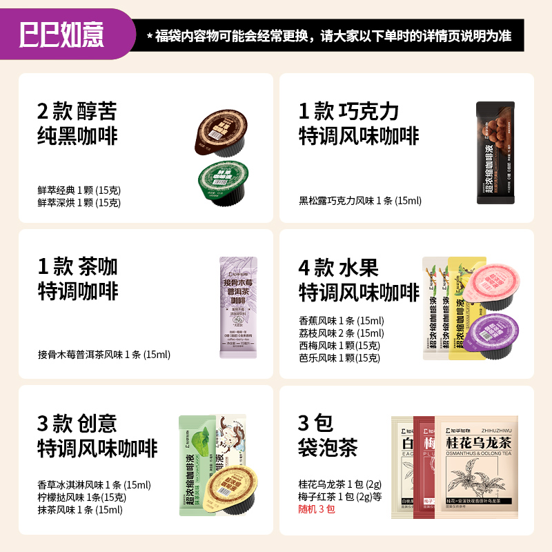 巳巳如意福袋——本批次产品保质期:鲜萃深烘保质期到26年6月25日;鲜萃咖啡液保质期到26年6月19日;芭乐风味保质期到26年3月30日;西梅风味保质期到26年1月22日;抹茶保质期到26年1月7日;接骨木保质期到26年4月18日;香草保质期到26年3月19日;香蕉保质期到26年3月17日,荔枝保质期到26年1月6日;黑松露保质期到26年7月15日,柠檬挞保质期到26年4月18日。