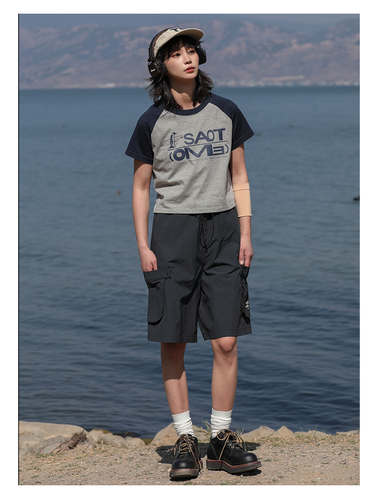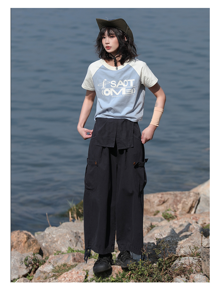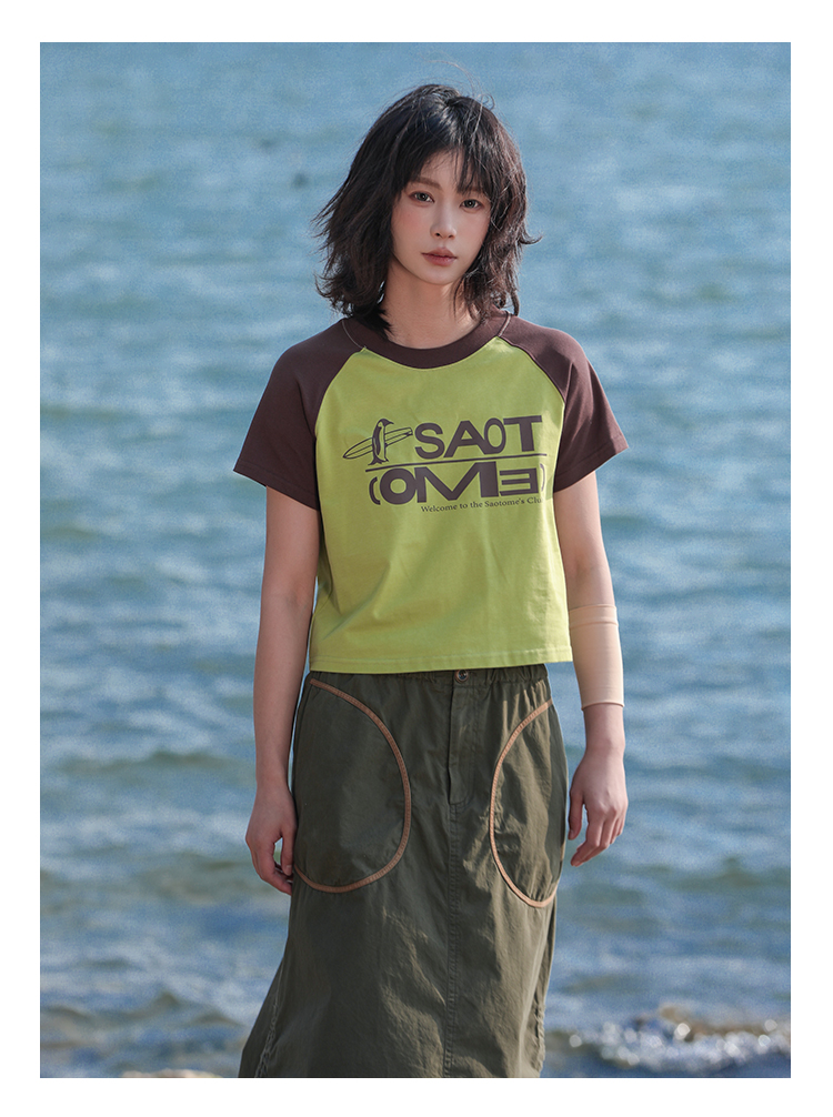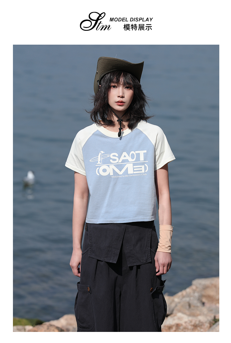 早乙女惠子saotome/STMDX242020/百搭插肩袖拼色logo短款T恤短袖