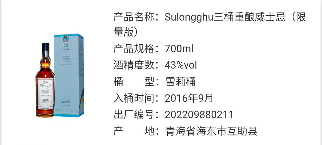 Sulongghu三桶重酿威士忌(限量版)中国威士忌