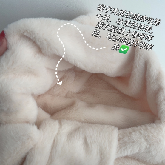 毛茸茸的款式显脸小 上面两只可爱的小耳朵也超立体 整体厚实保暖、可爱呆萌 穿上你就是可爱小熊本熊哟~
