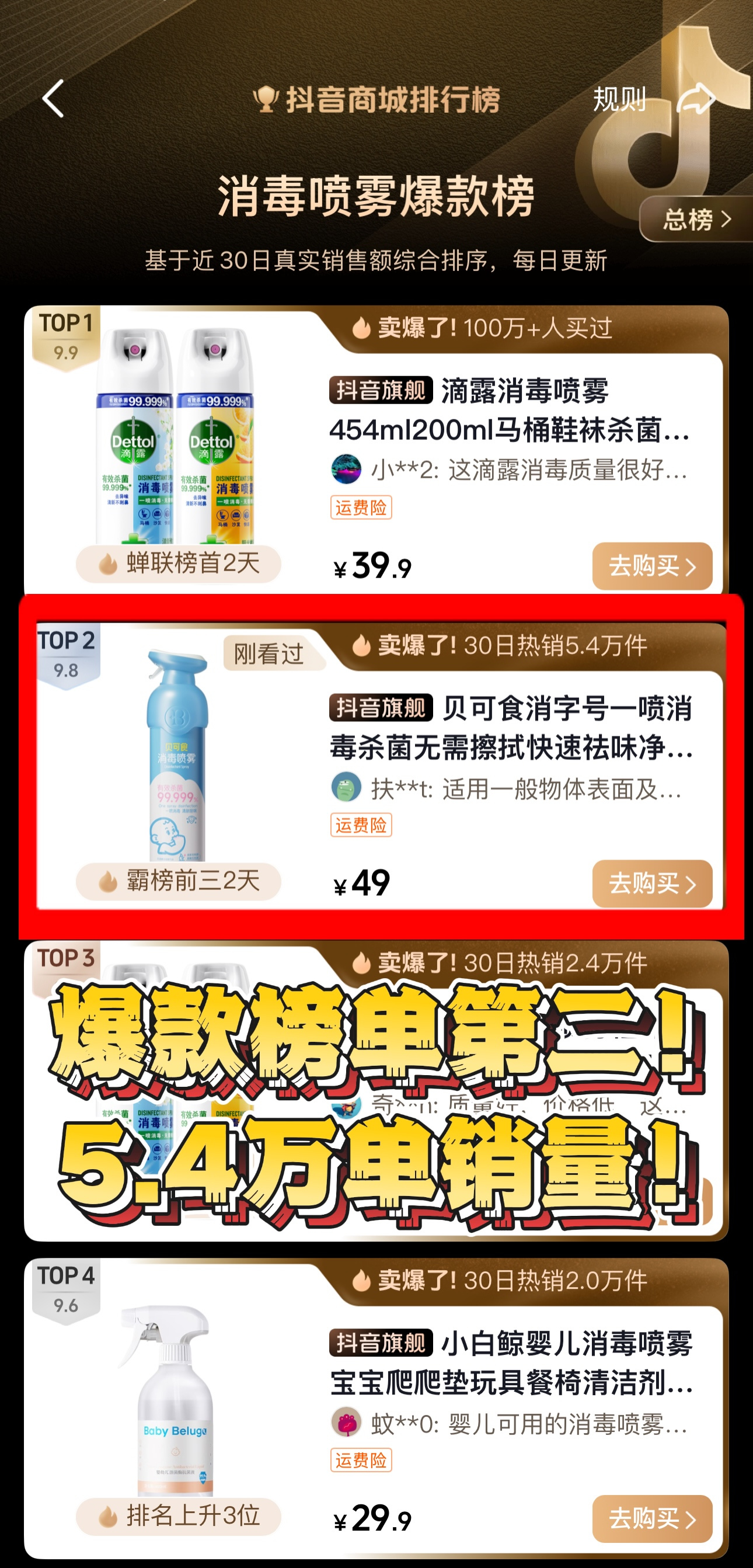 抖音消毒喷雾榜单第二!