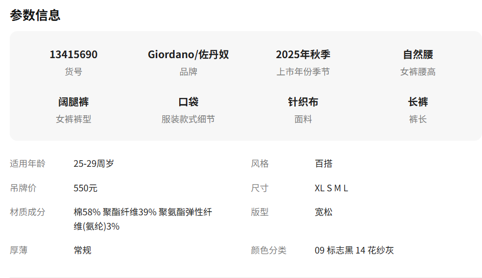 佐丹奴BM女装25年商场同款弹力垂感针织裤13415690