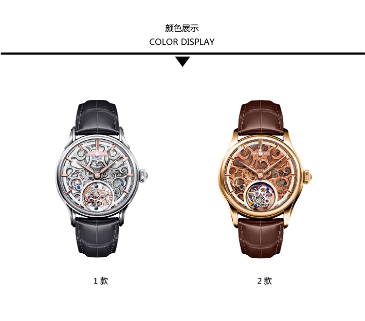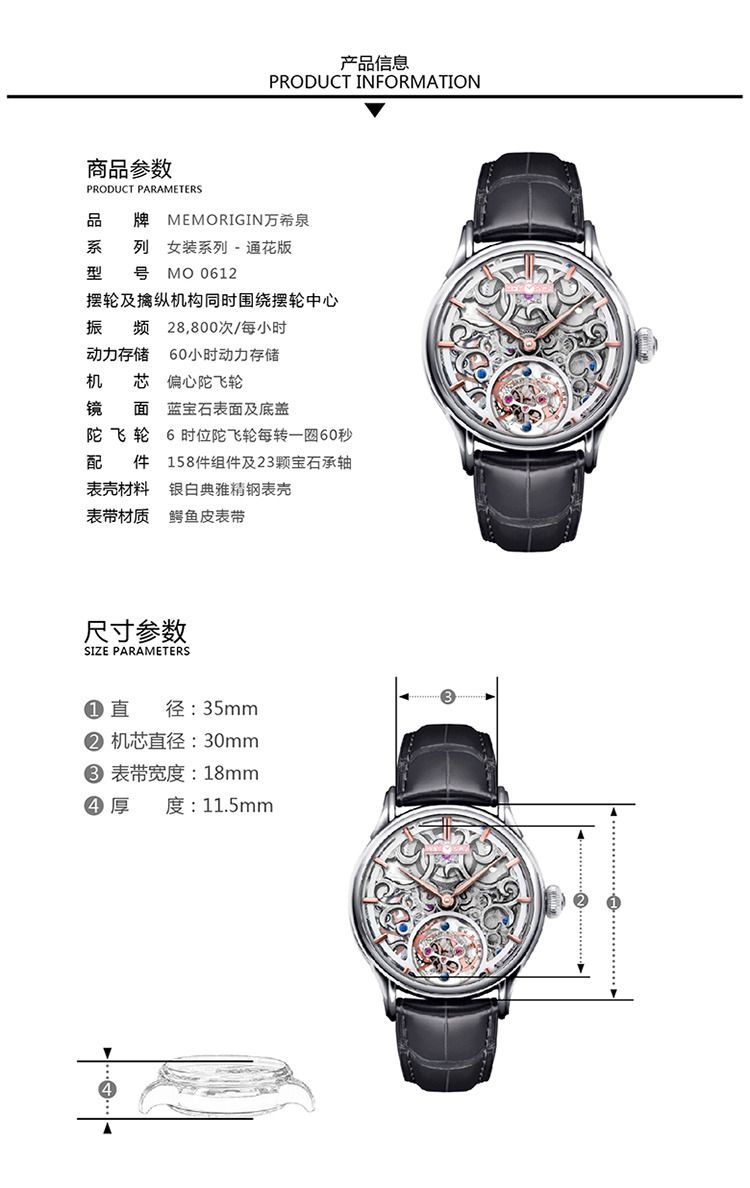 MEMORIGIN万希泉女装系列通花陀飞轮真皮腕表女刻字透底机械手表