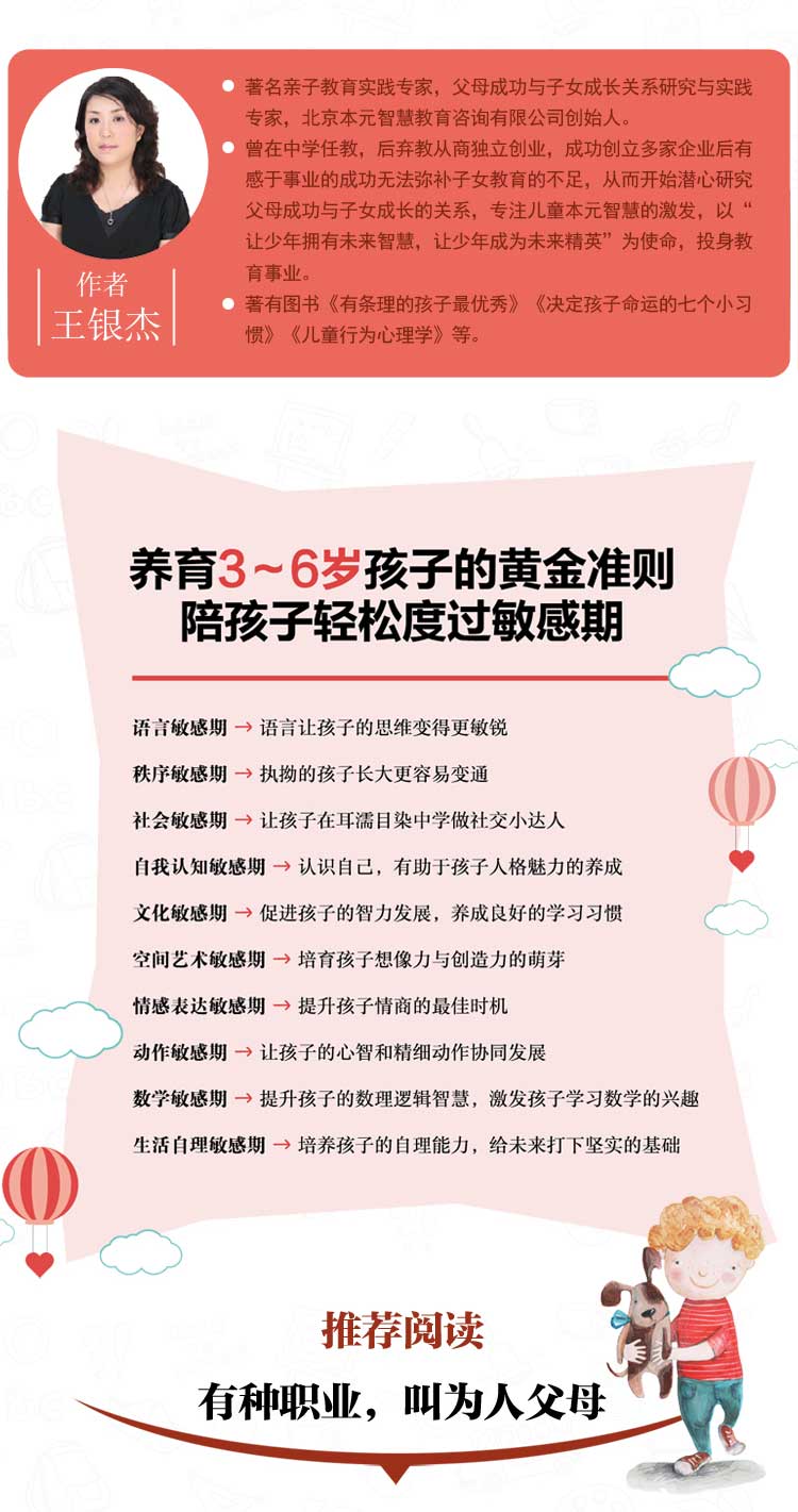 本书针对孩子的自然天赋和3~6岁的成长敏感时期,按孩子的生长规律、心理发展规律、生理心理学、神经医学、行为心理学等方面解读孩子的教育问题,帮助父母摆脱养育焦虑,引导孩子健康快乐的成长。