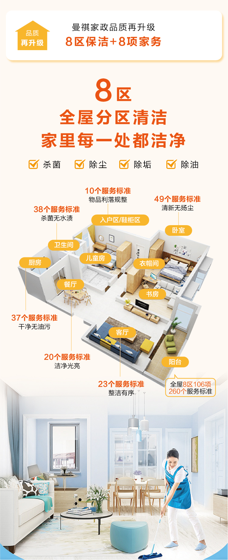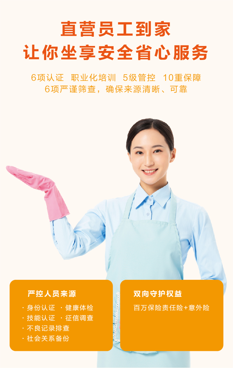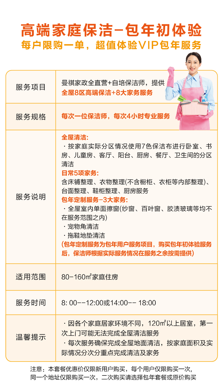 2.家庭保洁为固定4小时服务,上门服务时间为8:00-12:00,14:00-18:00,超出时间暂无法提供服务,请根据家庭情况预约合适人员上门!如遇服务旺季,请提前预约,以免耽误您的排程;