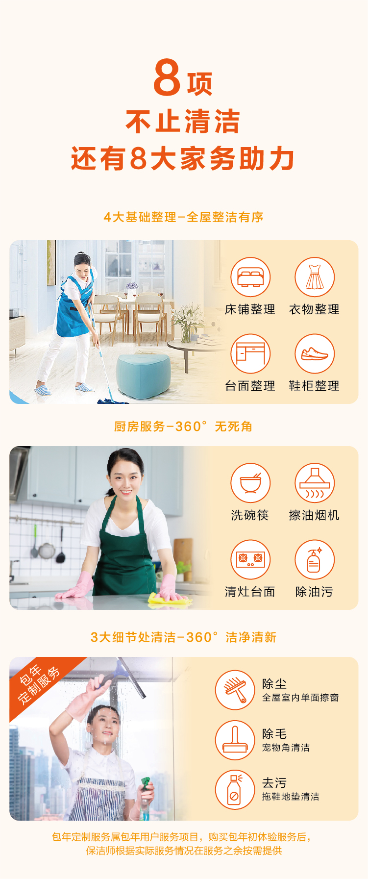 1.4小时家庭保洁服务为家庭表面清洁,服务内容包含厨房、客厅、卫生间、卧室、阳台、擦玻璃等家庭表面保洁;