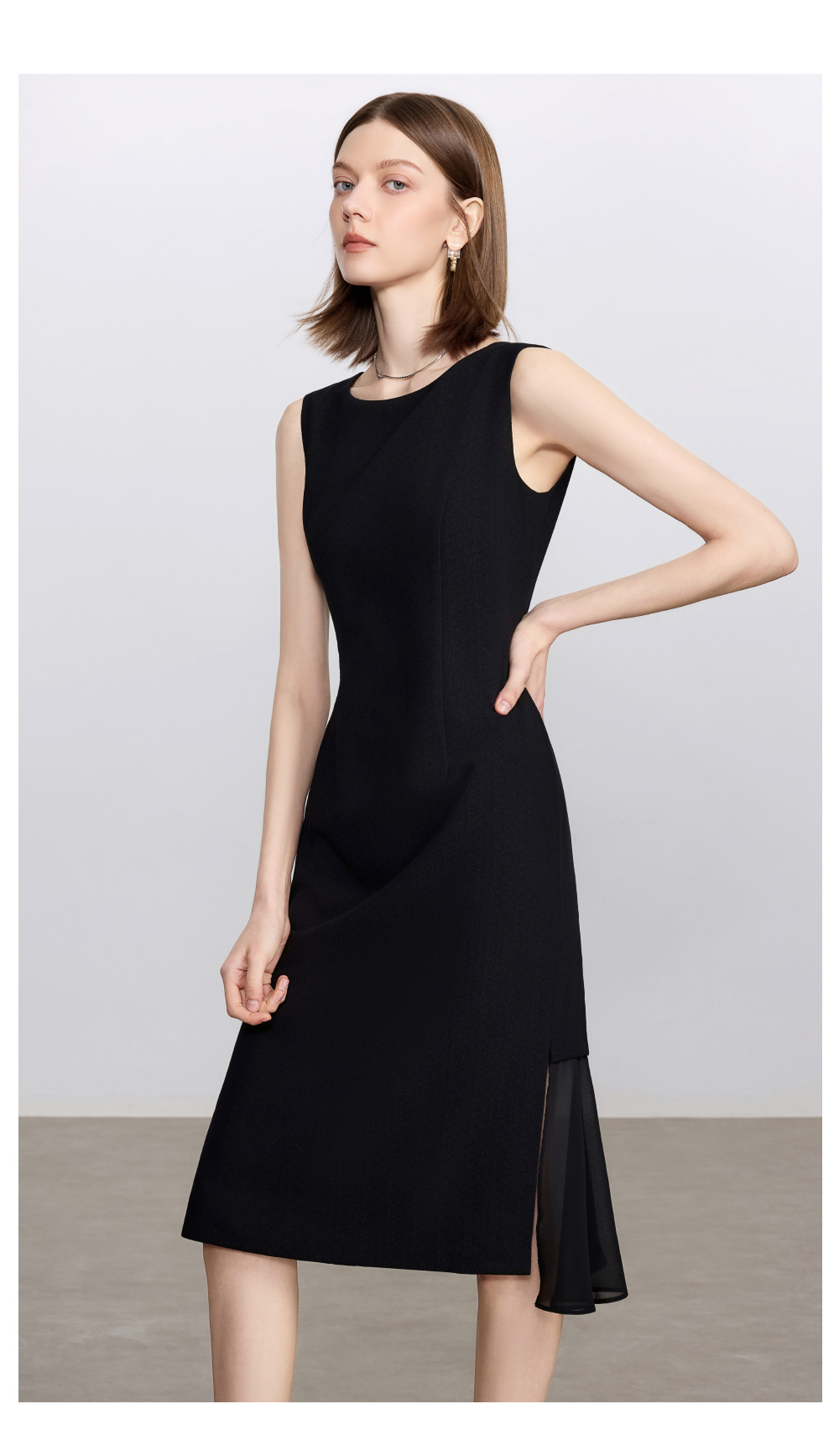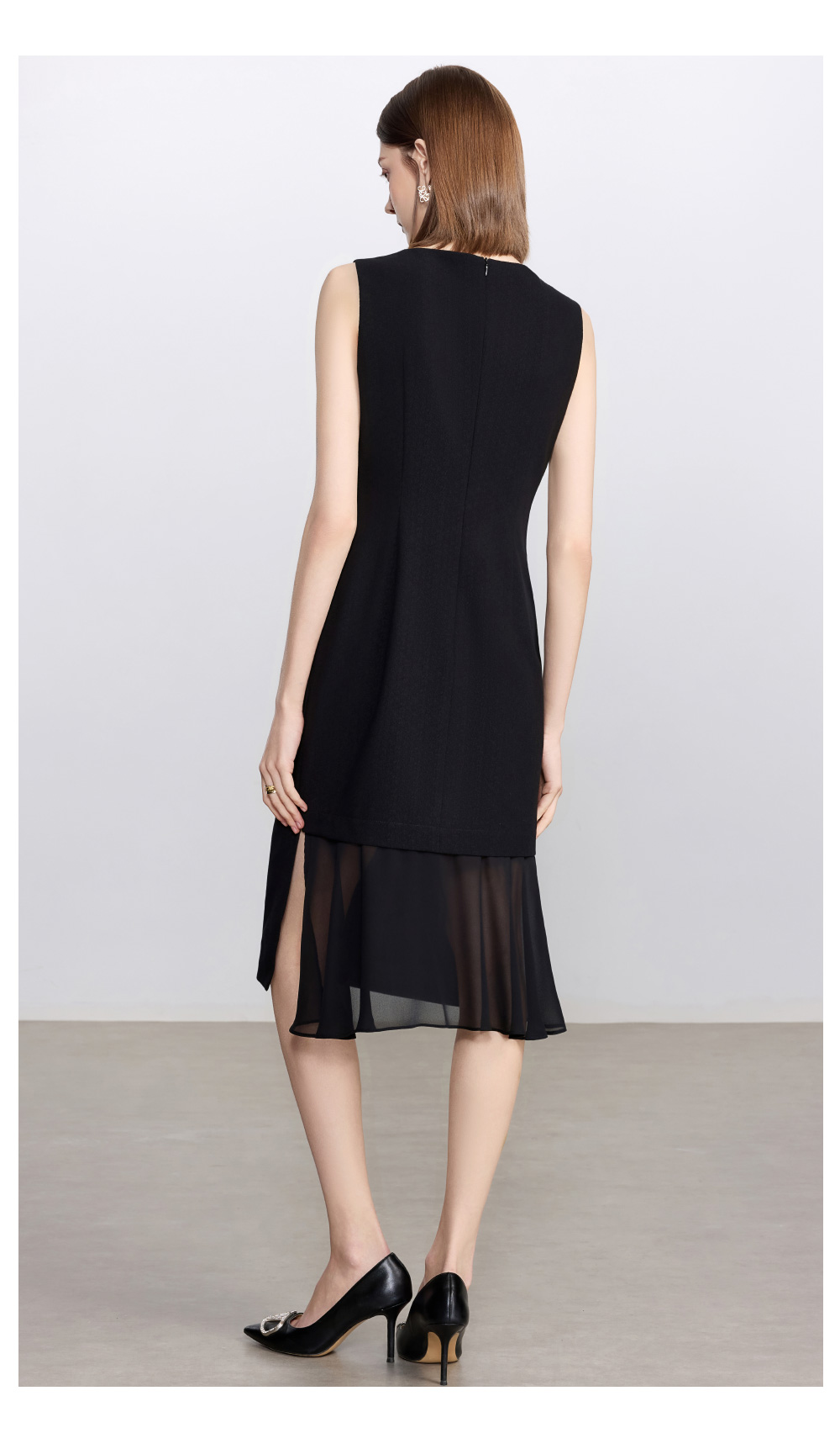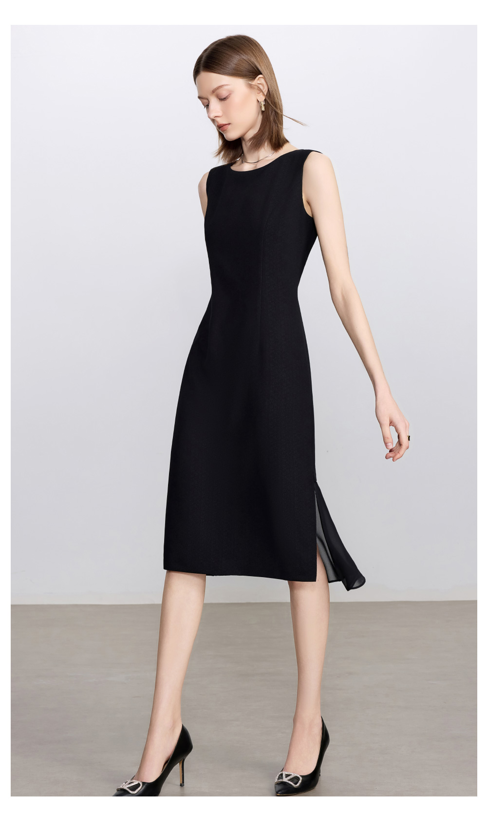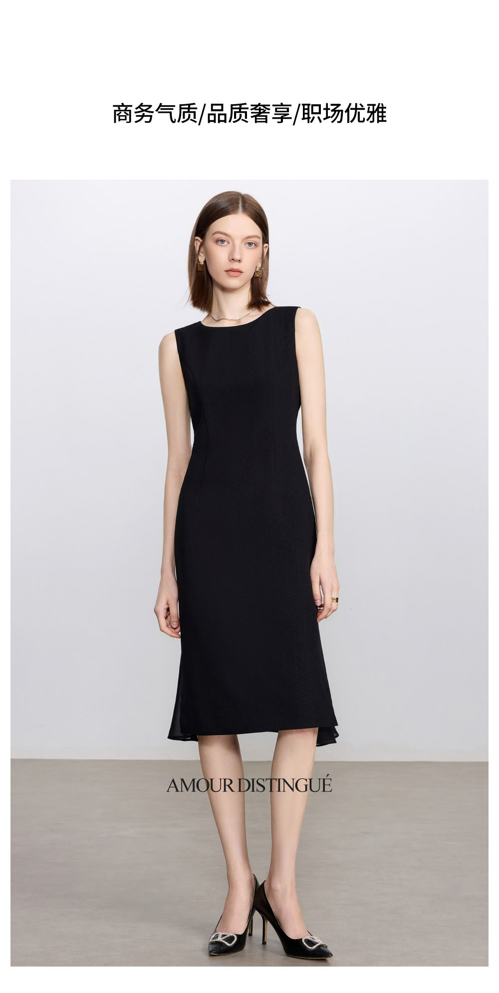 IWY/黑色无袖连衣裙女气质收腰干练职场正装通勤圆领长裙工作服Q1435
