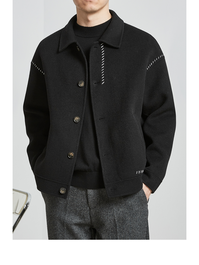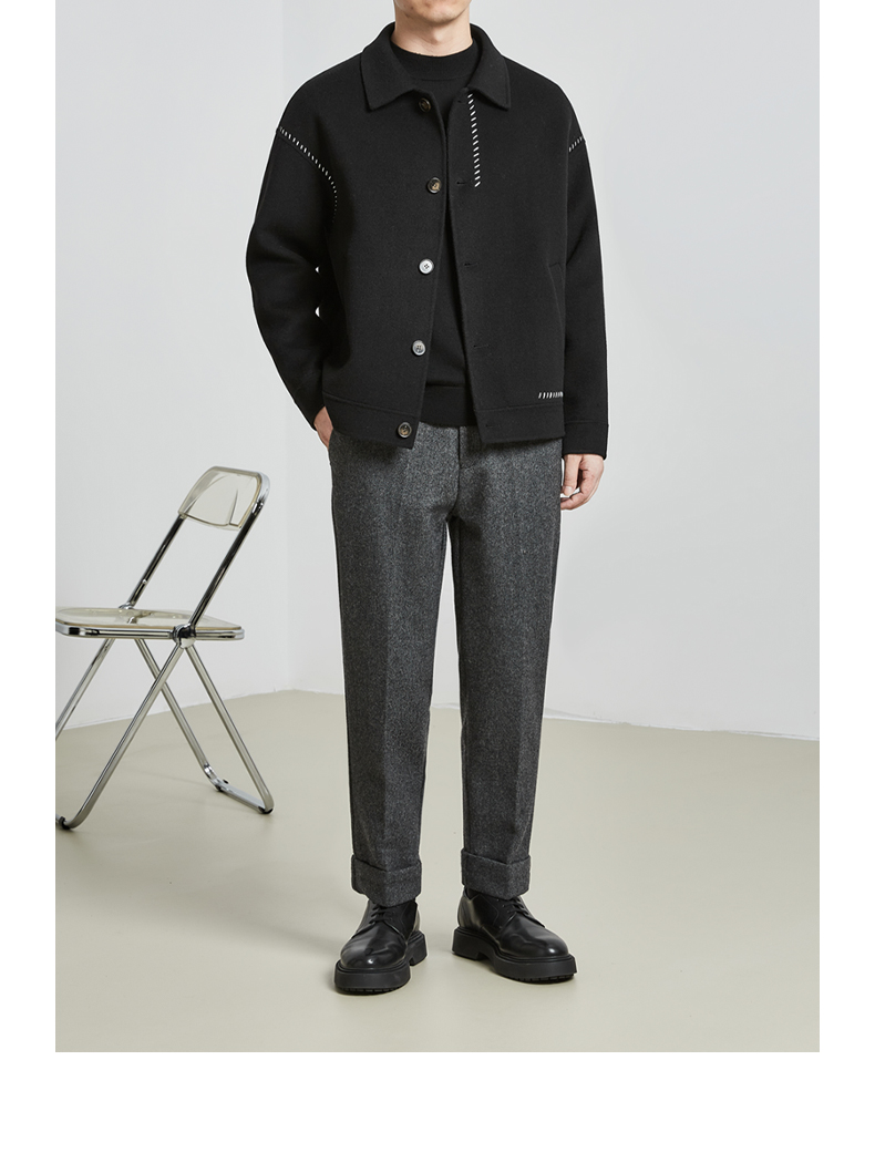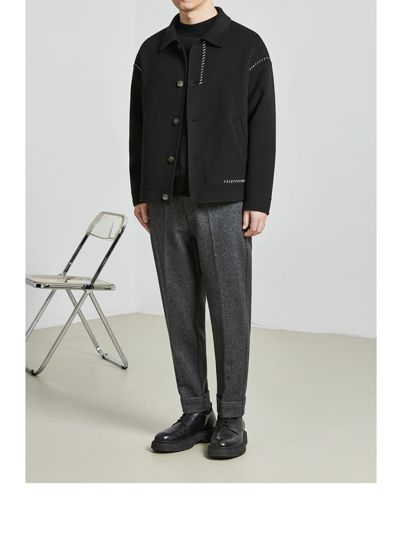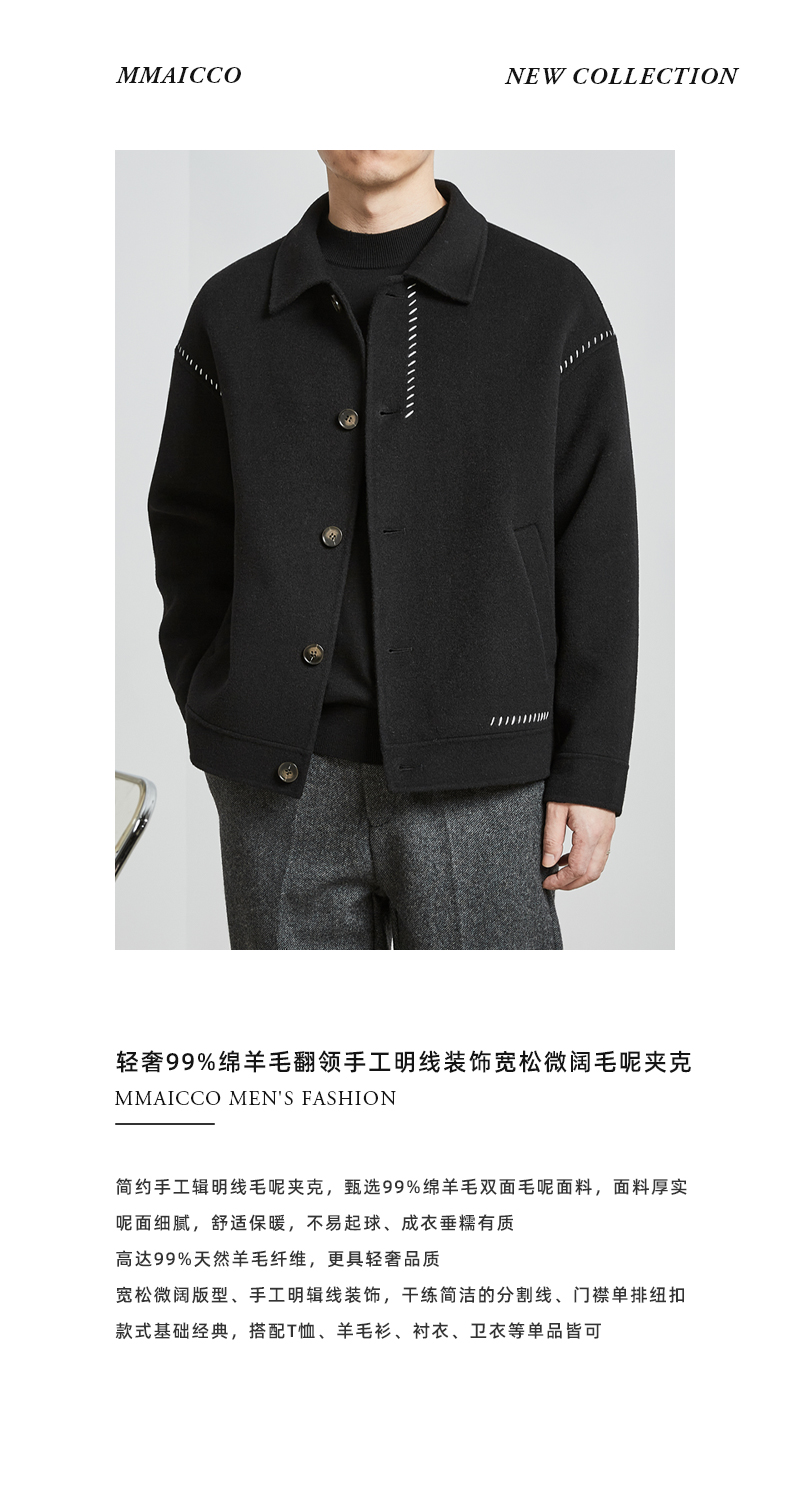 轻奢99%绵羊毛 翻领 手工明线装饰 宽松微阔 男士潮流毛呢夹克80183