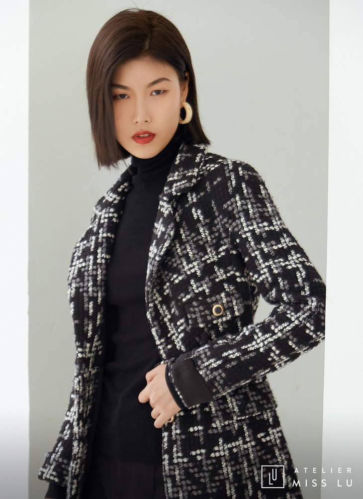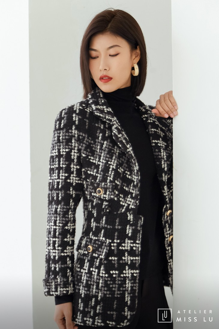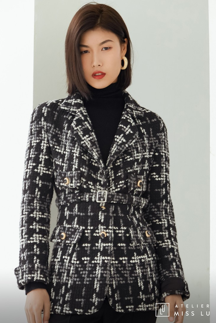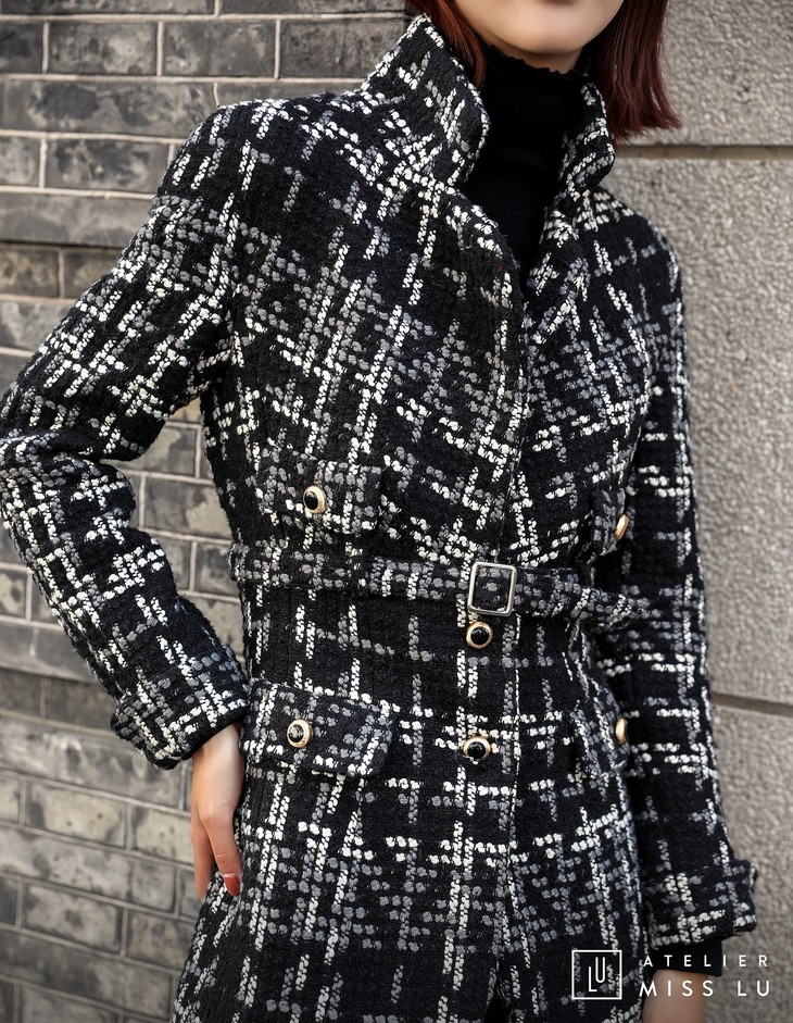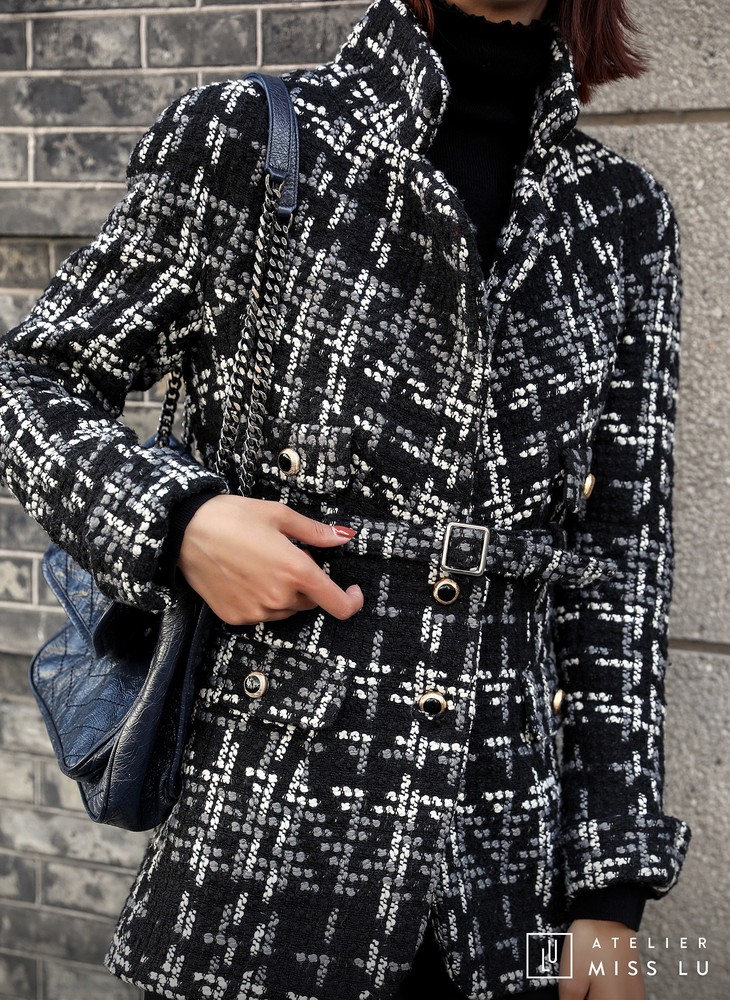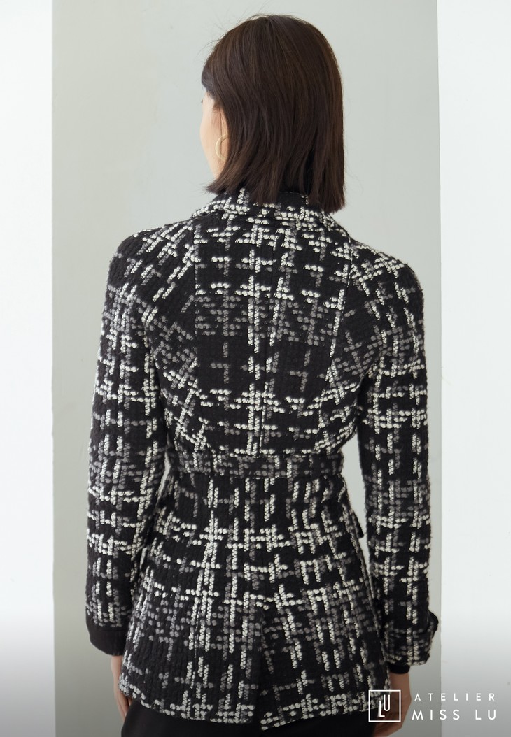 AtelierMissLu / Maisei-黑白粗呢格收腰翻领外套