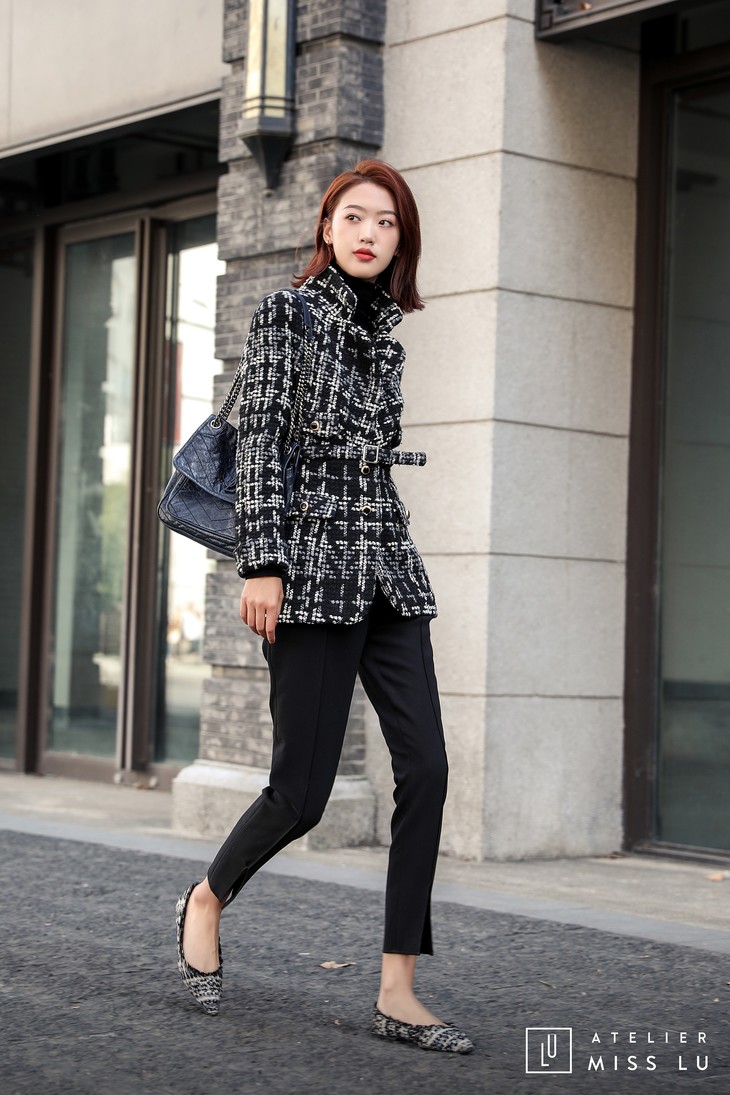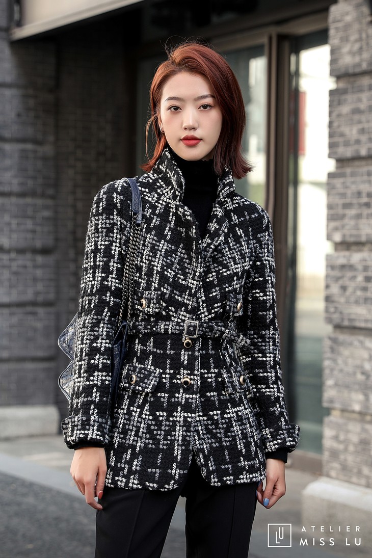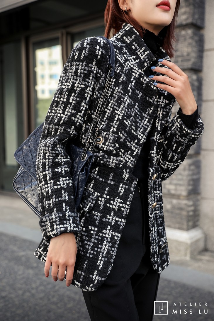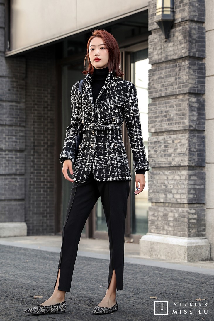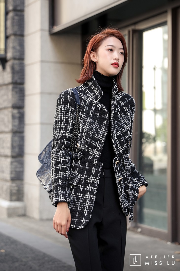 AtelierMissLu / Maisei-黑白粗呢格收腰翻领外套
