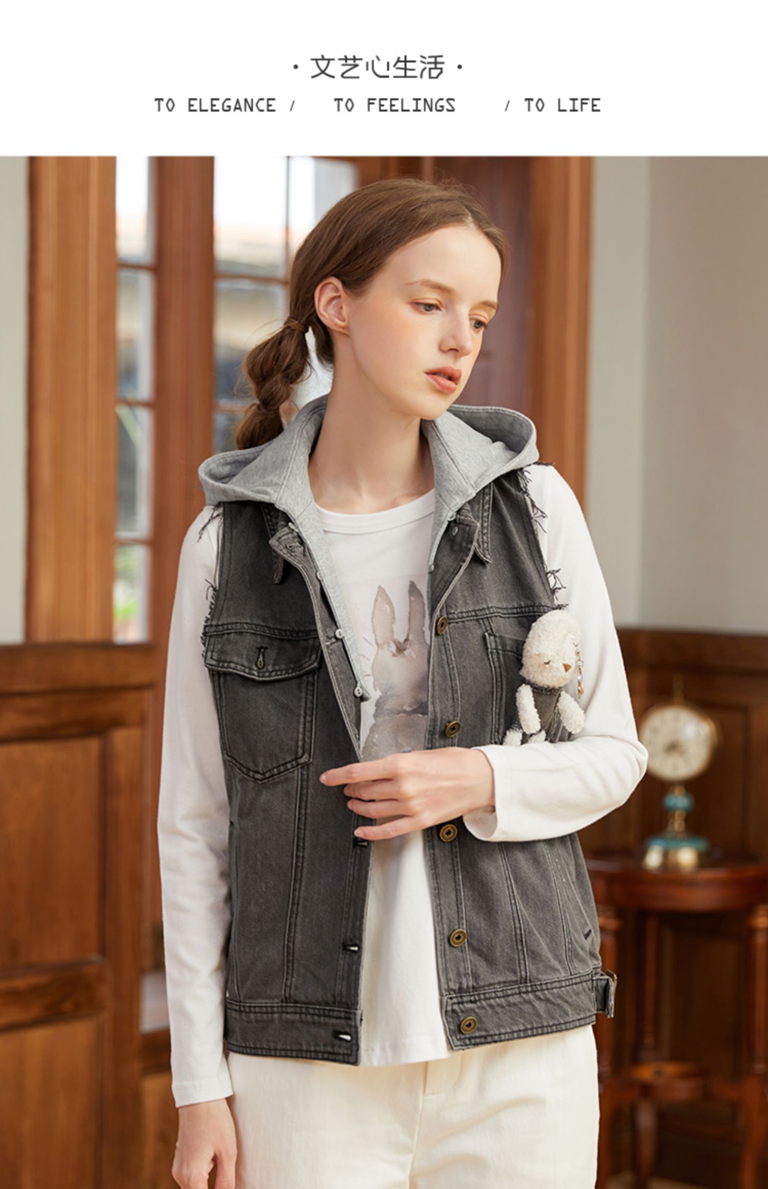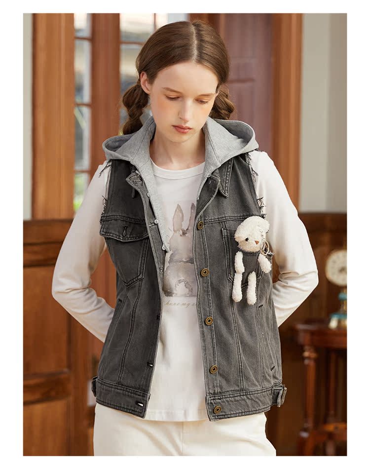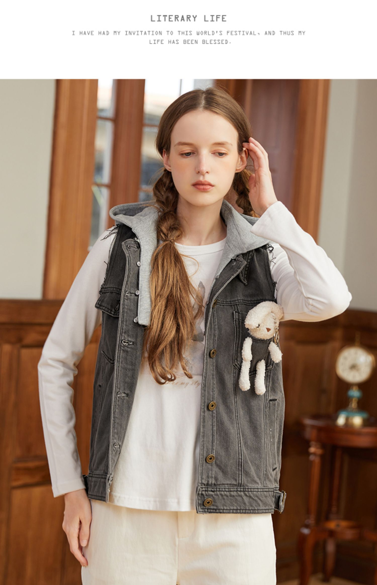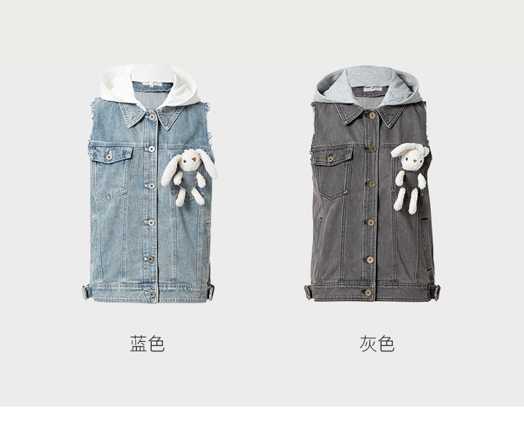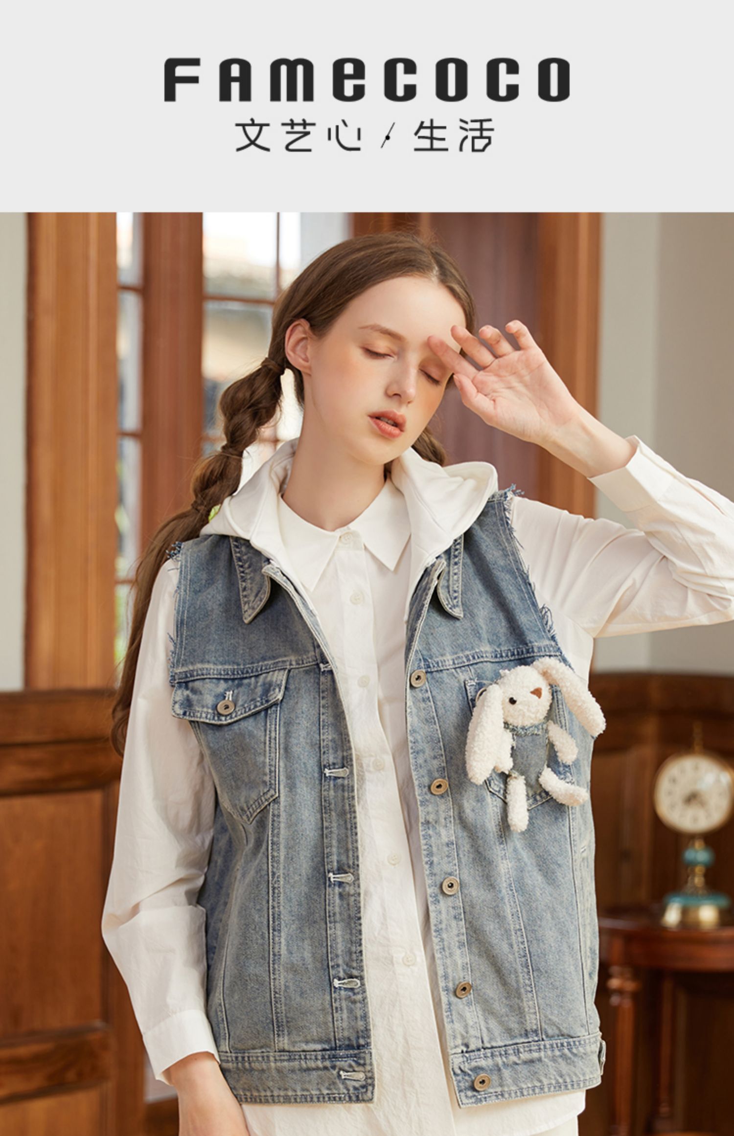 Famecoco范可儿连帽牛仔马甲女假两件原创可拆卸玩偶坎肩F216CA014