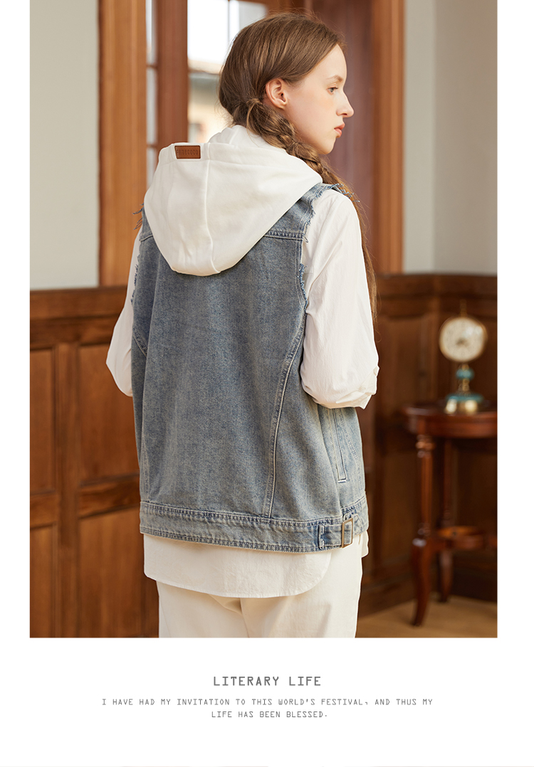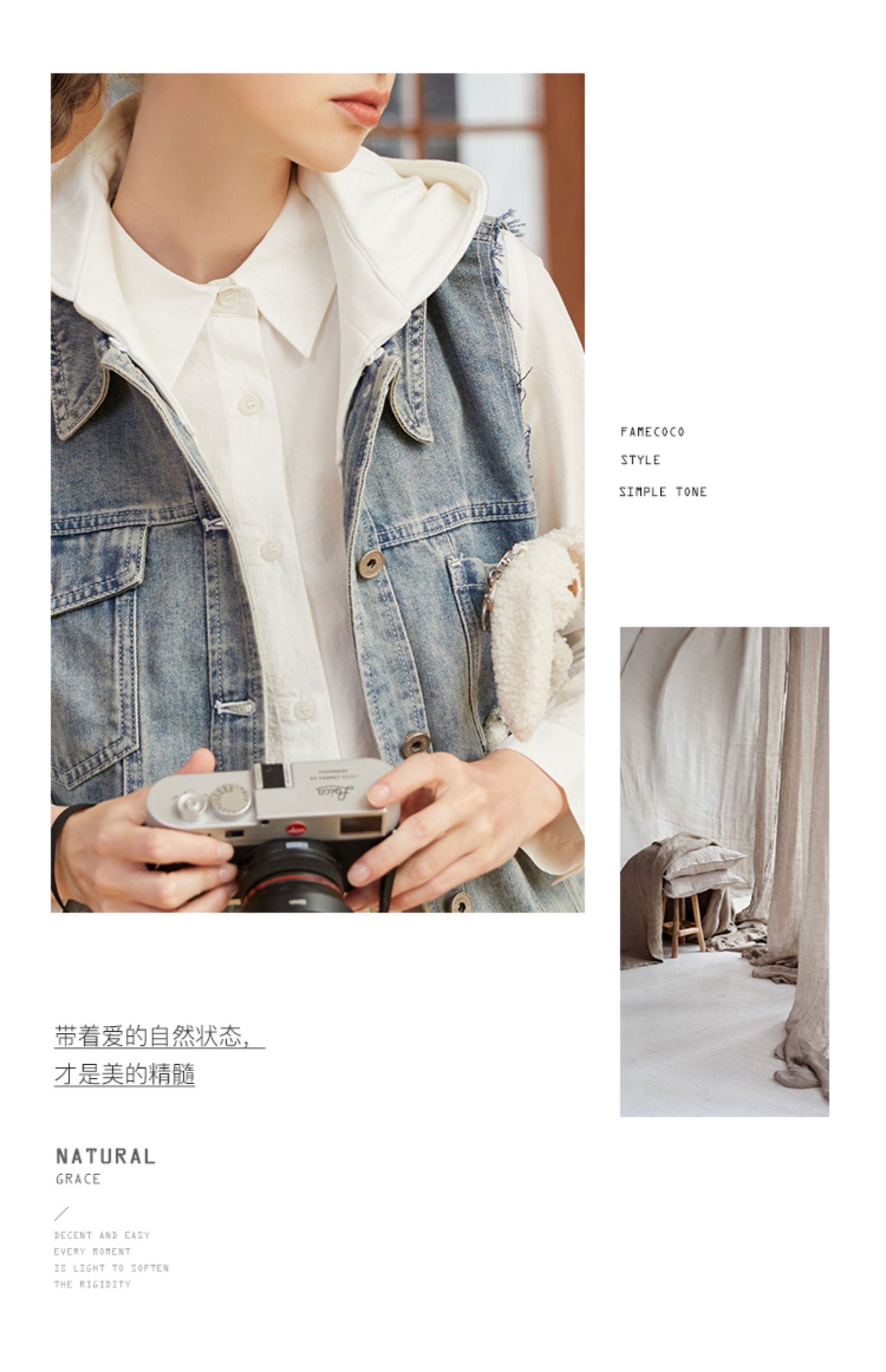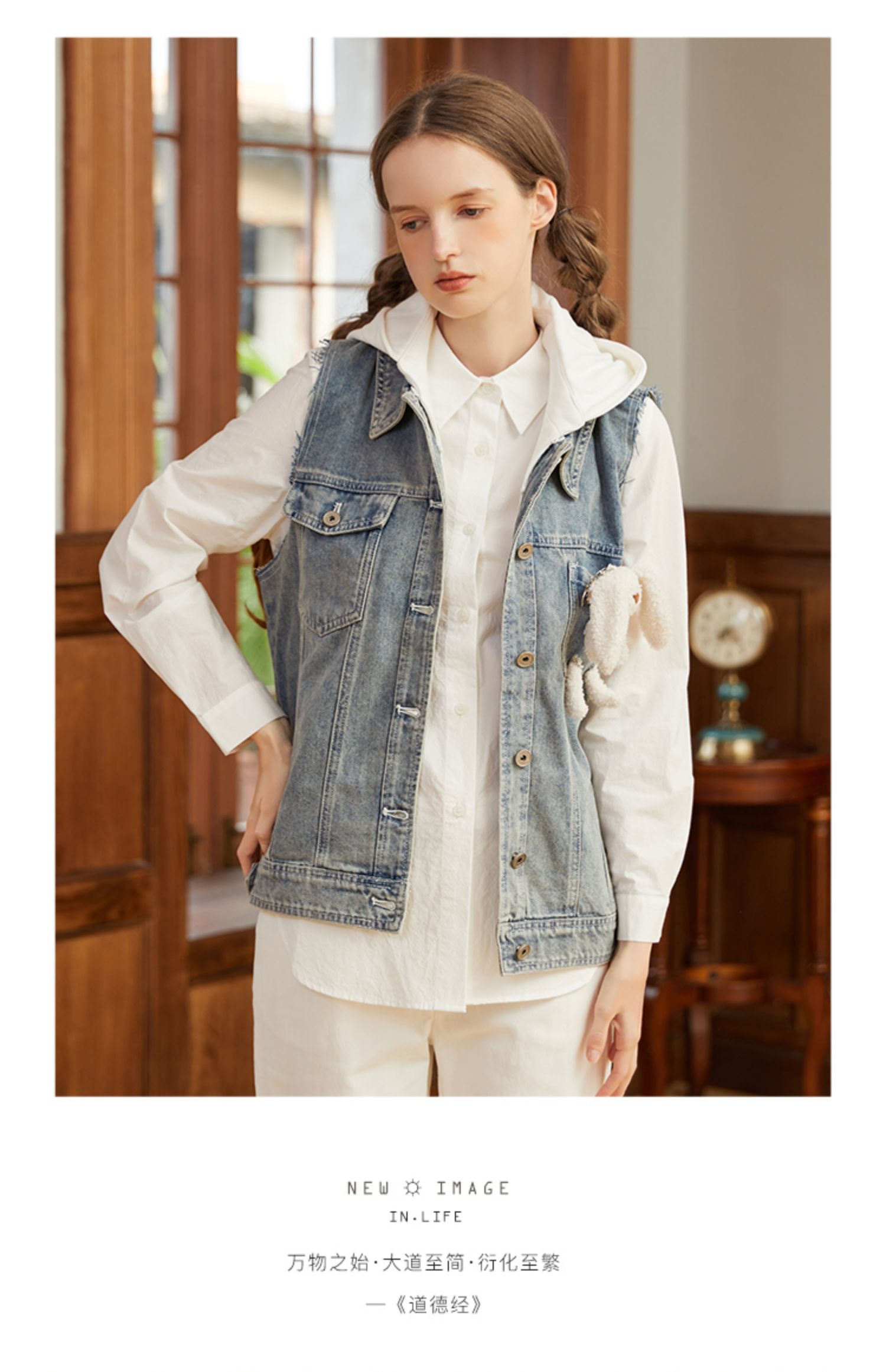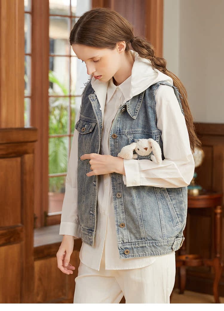 Famecoco范可儿连帽牛仔马甲女假两件原创可拆卸玩偶坎肩F216CA014