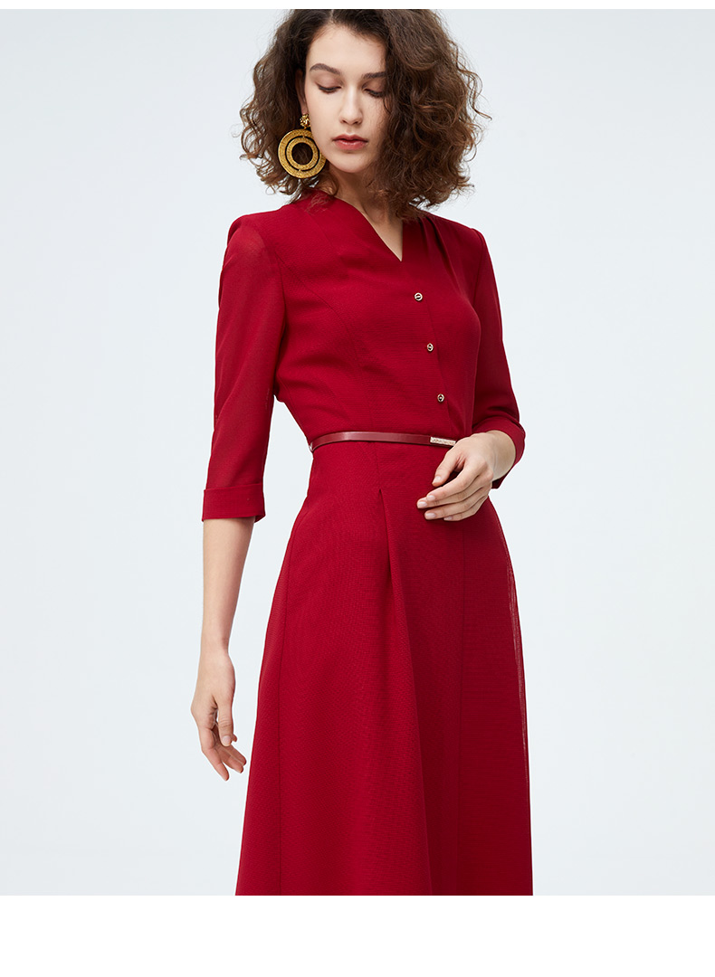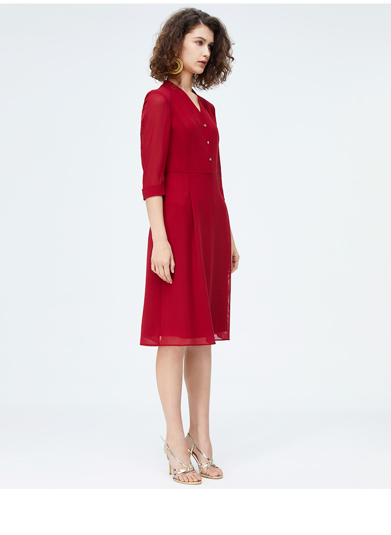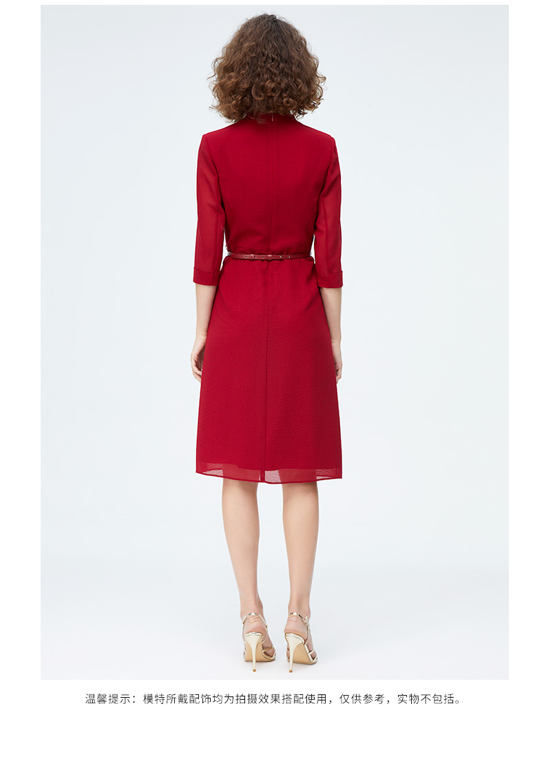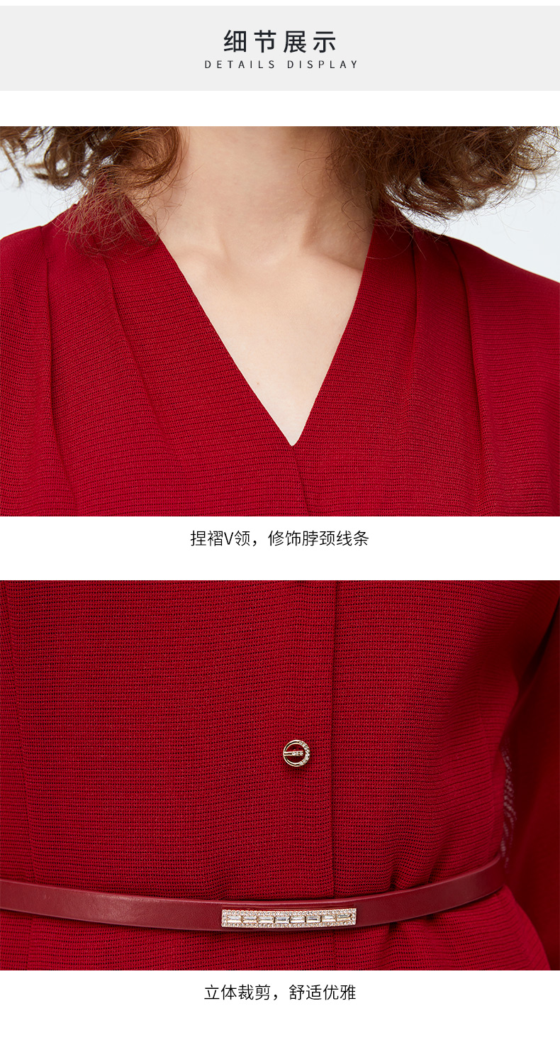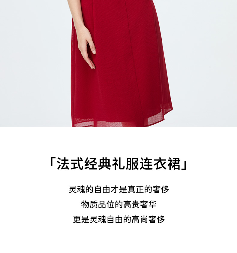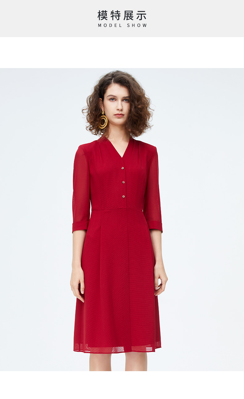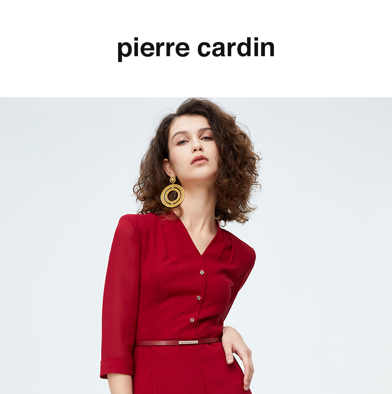 皮尔卡丹女装连衣裙法式经典短袖红色V领场合礼服裙P4215D4010R1