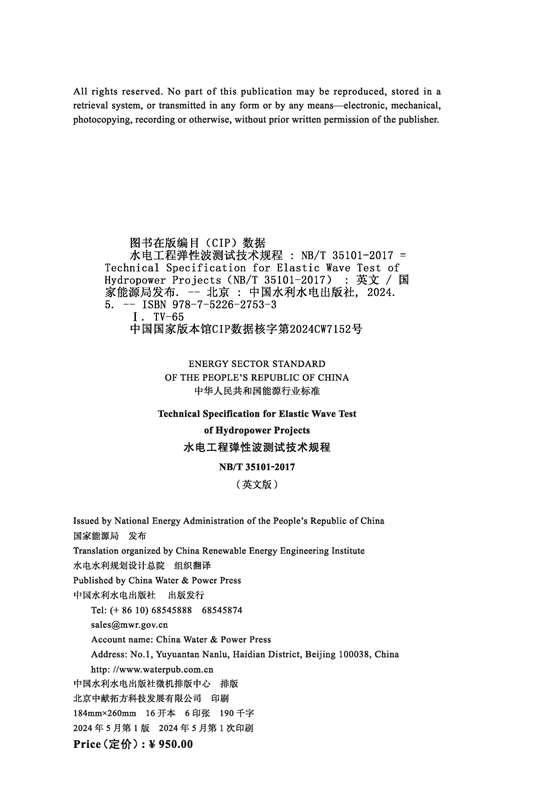 本译本为国家能源局委托水电水利规划设计总院按照有关程序和规定,统一组织翻译的能源行业标准英文版系列译本之一。2023年2月6日,国家能源局以2023年第1号公告予以公布。本译本是根据中国水利水电出版社出版的《水电工程弹性波测试技术规程》NBT 35101—2017翻译的,著作权归国家能源局所有。在使用过程中,如出现异议,以中文版为准。本译本在翻译和审核过程中,本标准编制单位及编制组有关成员给予了积极协助。为不断提高本译本的质量,欢迎使用者提出意见和建议,并反馈给水电水利规划设计总院。