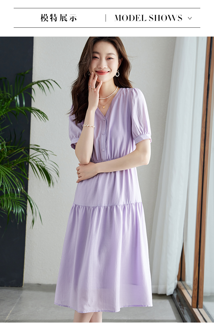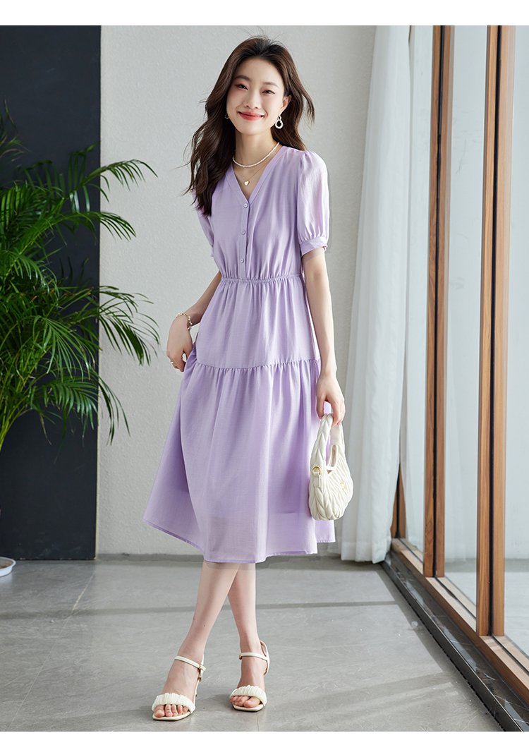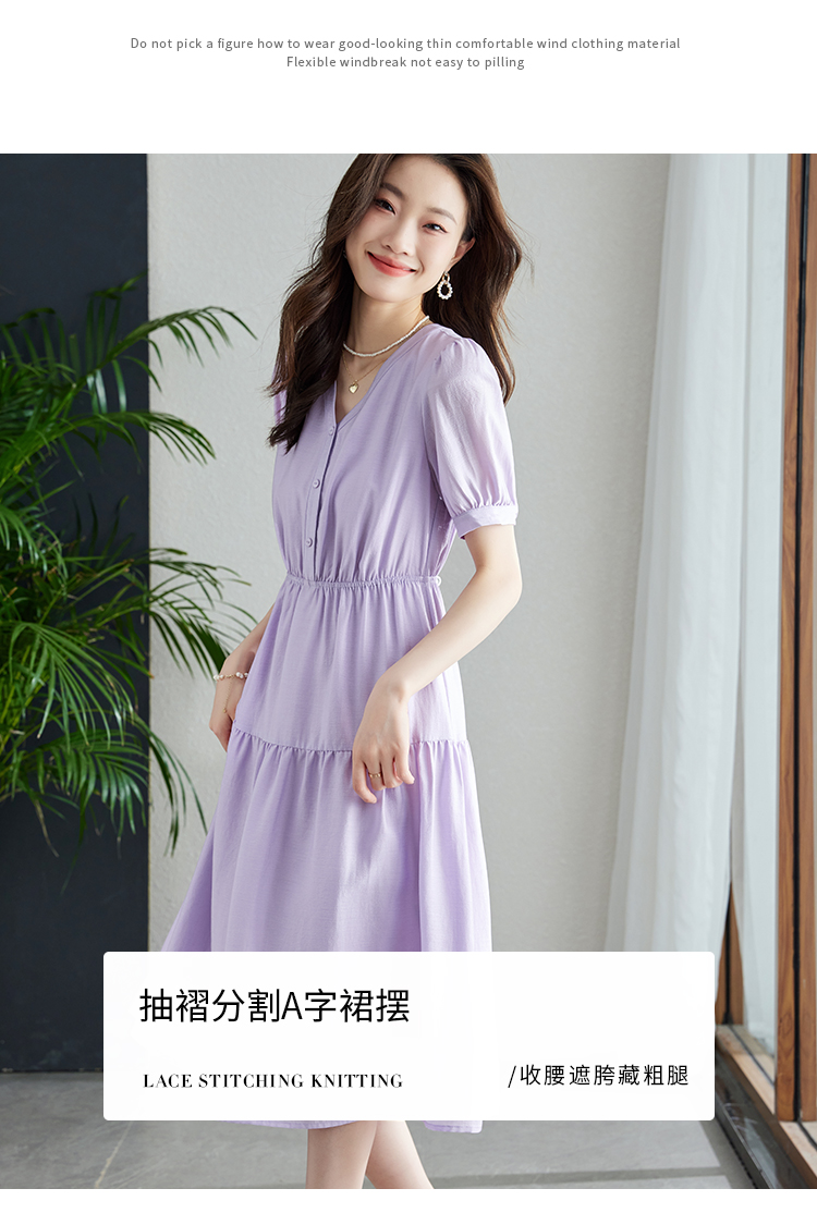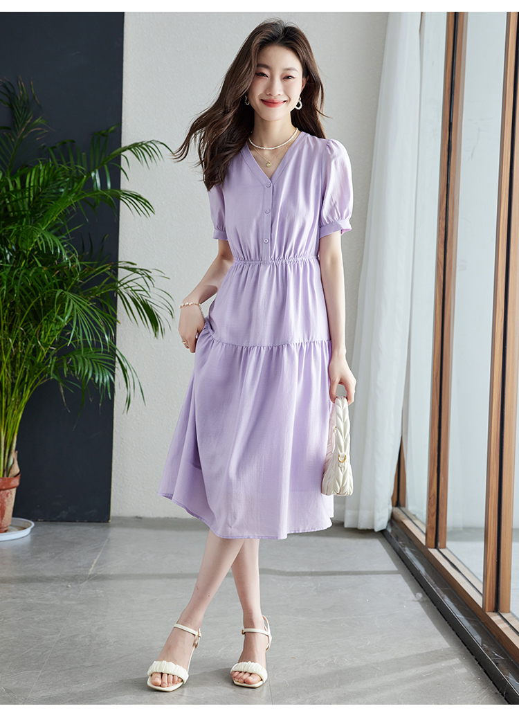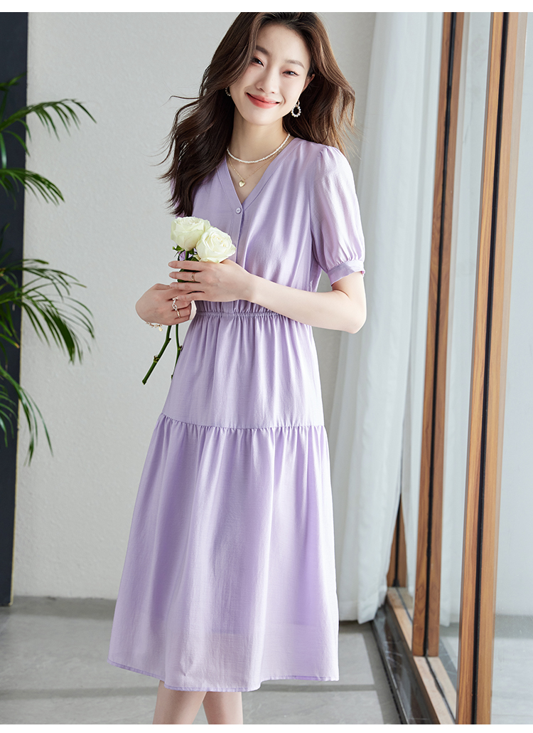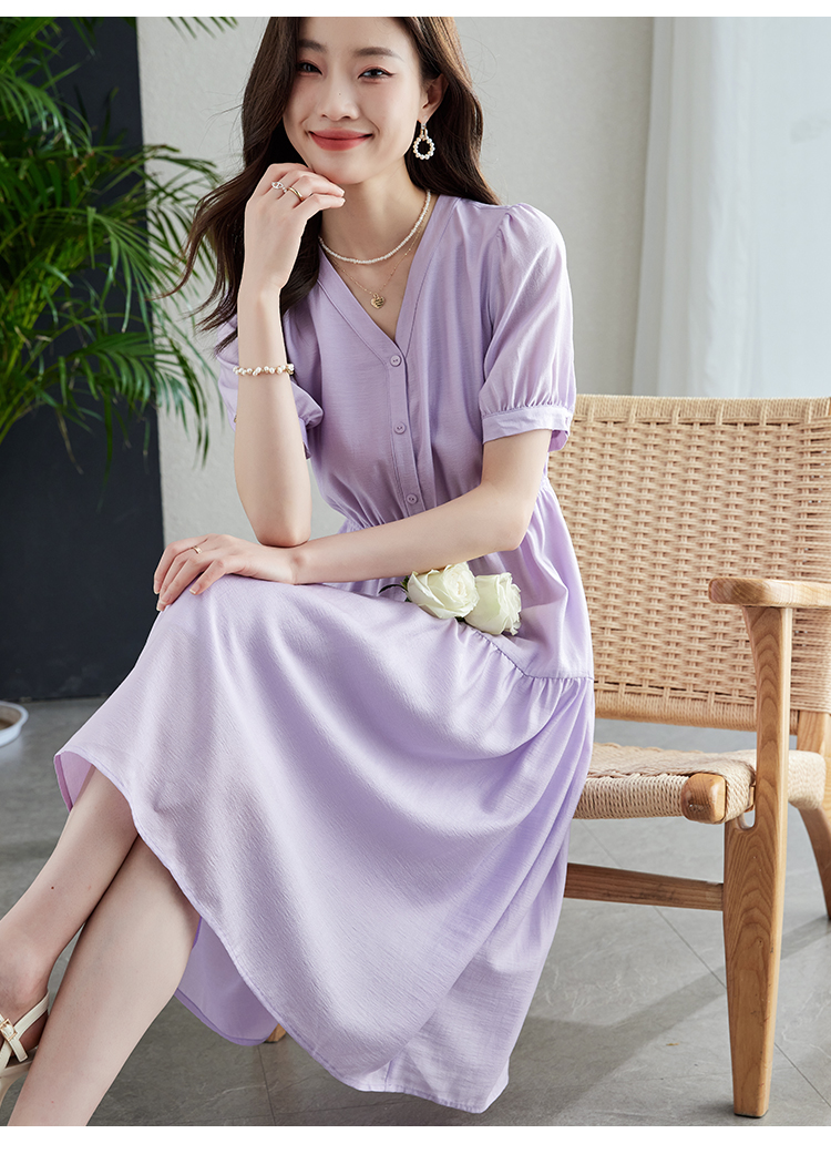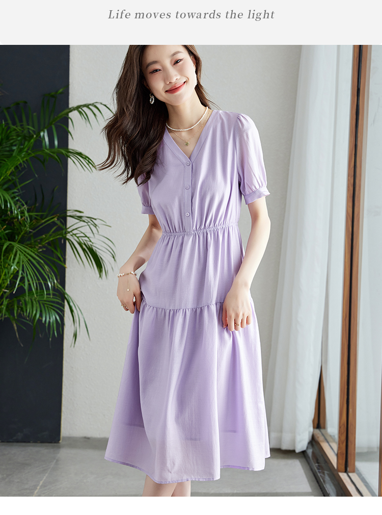 【1件82折,2件8折】熙世界紫色复古a字连衣裙女夏季新款法式收腰显瘦温柔风V领茶歇裙