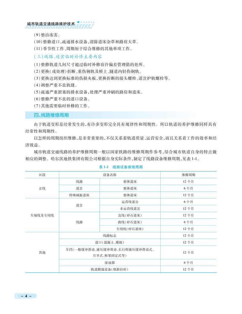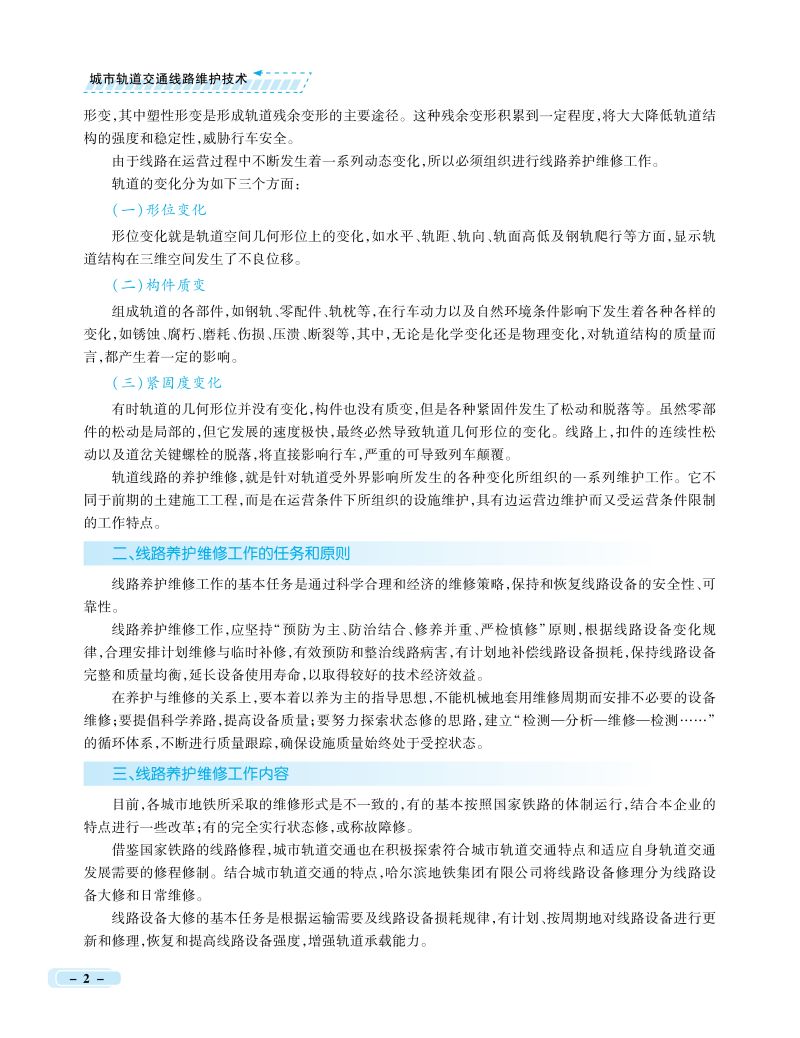 本书力求通用性好、适用性强。教材以哈尔滨地铁运营公司的技术装备和运营实践为主,同时结合其他地铁公司的设备和运营管理情况,力求满足中、高职学校城市轨道交通相关专业作为选用教材需要外,还可作为各地铁公司工务岗位技能培训用书。