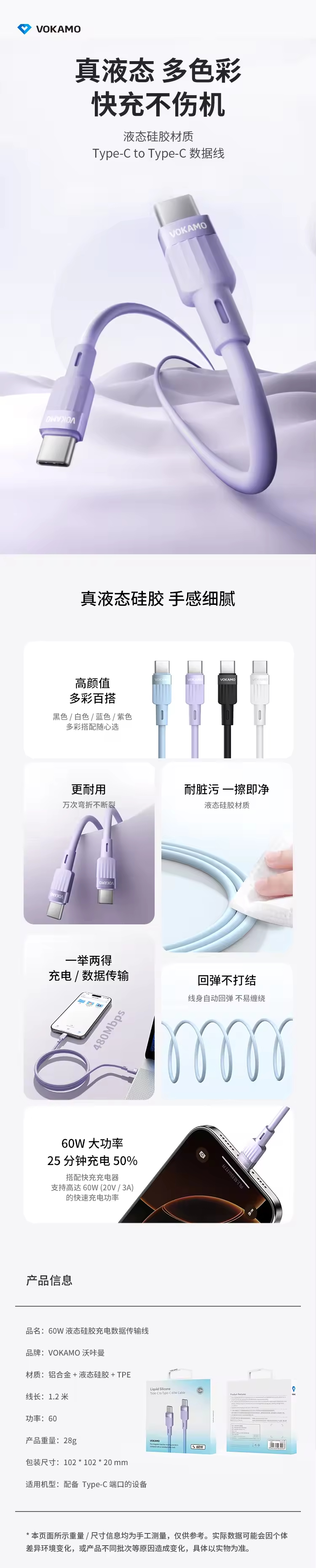 VOKAMO沃咔曼 USB-C 60W iPhone 液态硅胶数据传输线